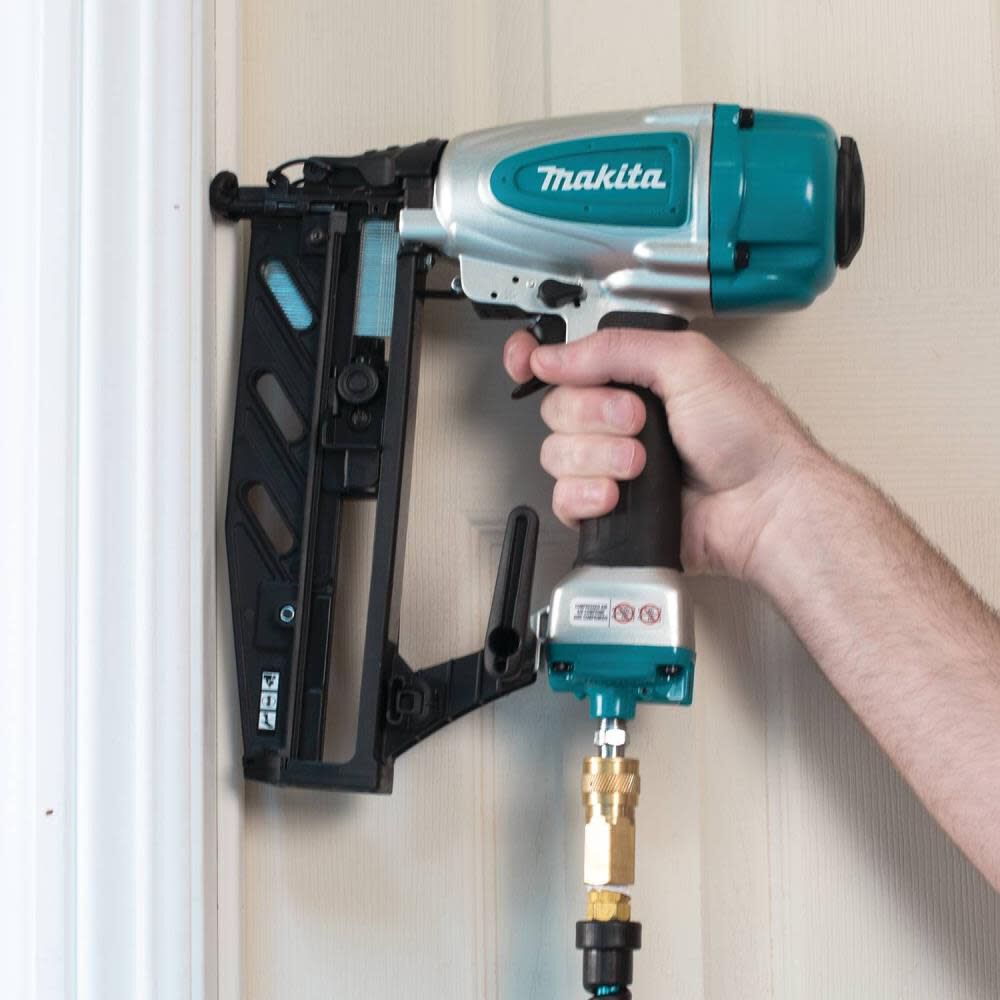The Makita® 16 gauge 2‑1/2 Inch straight finish nailer is built with motor which drives 1 Inch to 2-1/2 Inch nails. It is designed with sturdy magnesium body construction for long lasting life. The nail lock-out mechanism and housing bumpers safeguard your tool and work surface from pin-less blank fires or dry-fires. The rear loading magazine accommodates up to 100 nails. It comes with an air duster for clearing work surface and a rear exhaust port for directing exhaust air away from operator and work surface. This nailer tool assures optimum pinning accuracy with its two removable no-mar tips having sightlines. It also provides nailing access in smaller spaces because of its narrow nose design. Includes reversible belt hook and soft integrated rubber grip for user convenience. With least recommended air delivery of 2.7 SCFM at 90 PSI pressure, this tool is suitable for almost all kinds of woodworking applications. This product comes with pneumatic nailer oil, safety glasses, air fitting, two no-mar tips and a tool case. It has limited warranty of 3 years.