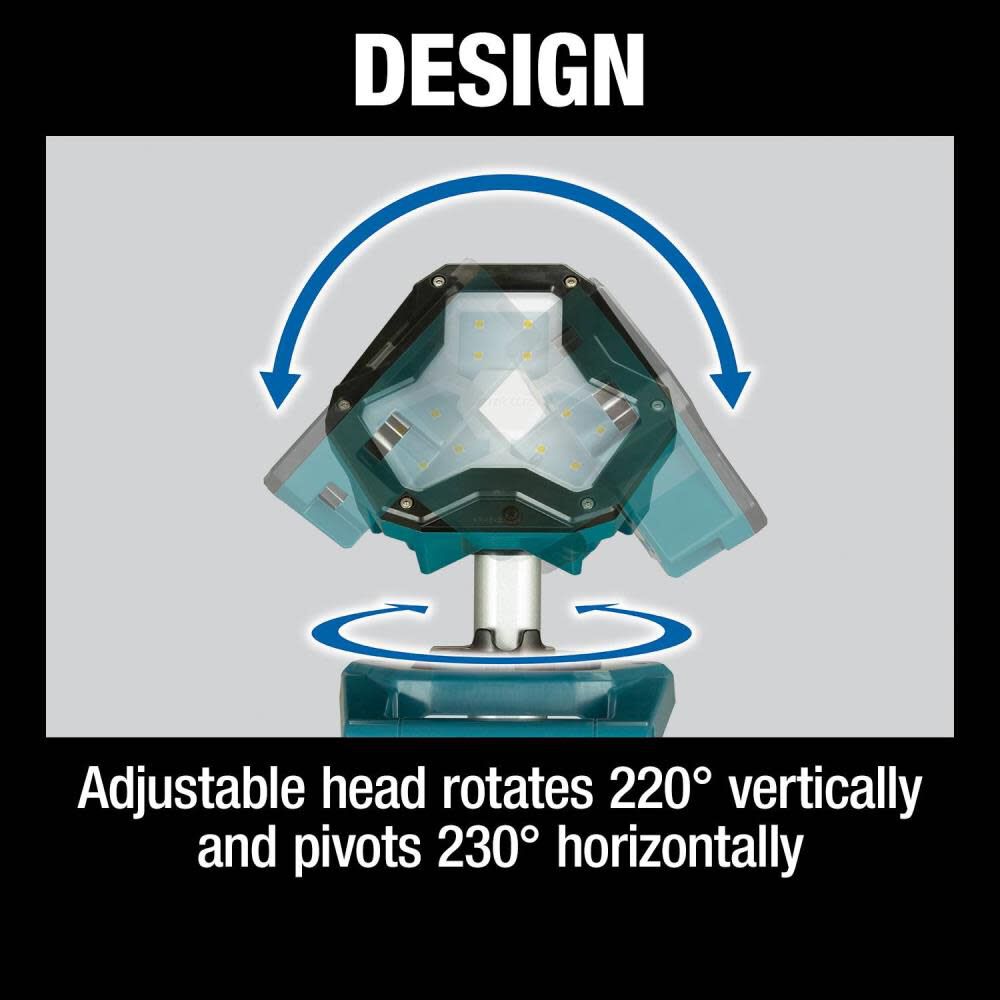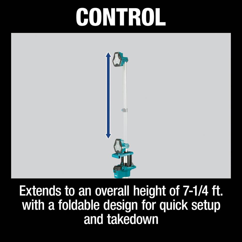 The 18V LXT® Tower Work Light (DML813, tool only) is a tall, towering light extending to an overall height of 7-1/4 feet. It delivers 3,000 /1,700 /900 lumens on High / Medium / Low settings. Get up to 8 hours of continuous illumination with one 18V LXT 5.0Ah Battery on low and up to 2 hours on high (battery and charger not included). L.E.D. lights effectively illuminate work area without the high heat of halogens. This tower light features an adjustable head that rotates 220-degrees vertically and pivots 230-degrees horizontally. Other features include a dust and water-resistant construction (IP55-rated when using battery) for improved operation in harsh job site conditions. The tower folds and features convenient should strap and handles for easy transportation. It is part of Makita’s 18V LXT System. The LXT Cordless System, the world’s largest cordless tool system powered by 18V lithium-ion slide-style batteries, takes a user from power tools to outdoor power equipment to get the job done. Makita 18V LXT Batteries have the fastest charge times in their categories, so they spend more time working and less time sitting on the charger.