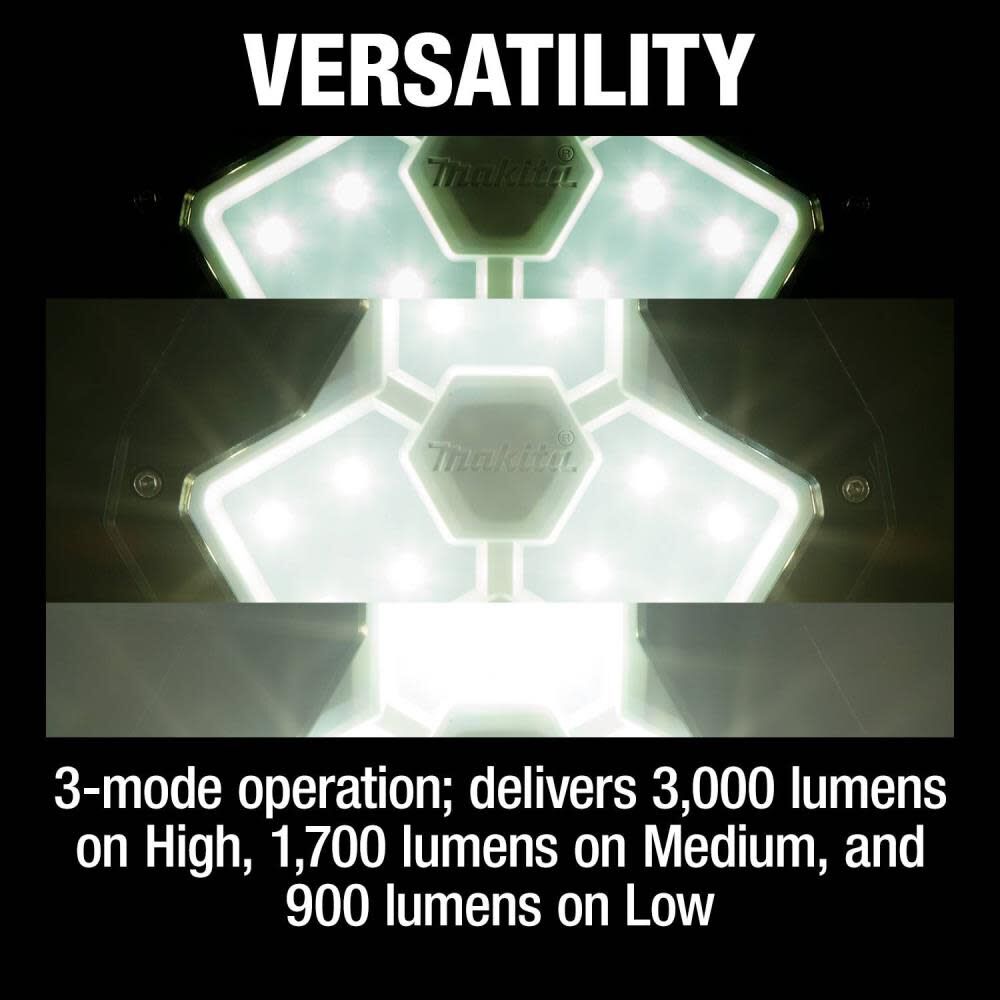3-mode operation; delivers 3,000 lumens on High, 1,700 lumens on Medium, and 900 lumens on Low