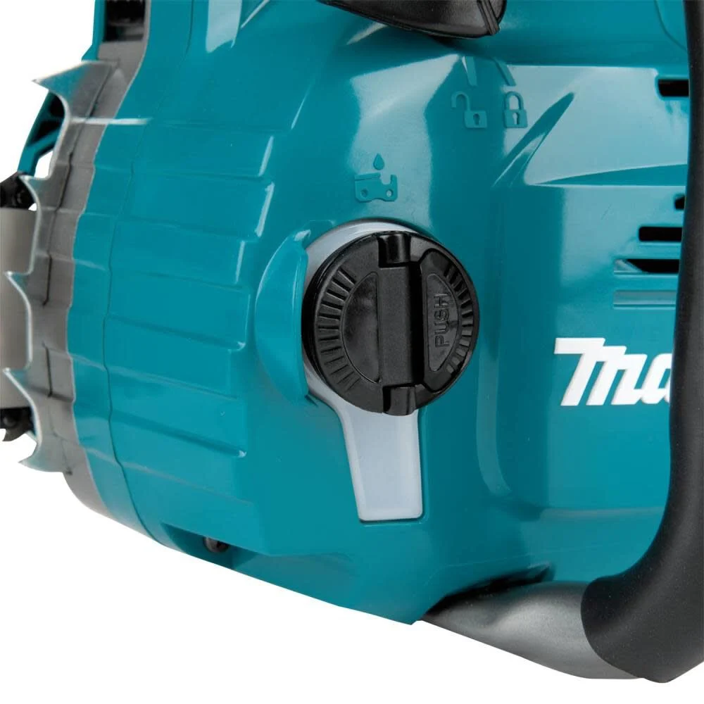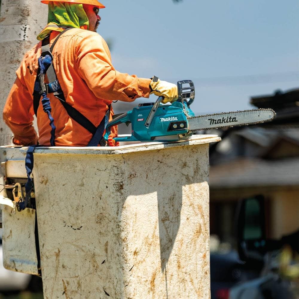 The Makita cordless 18 Inch chain saw kit contains a 18 Inch chain saw, 40 Volt max XGT® lithium-ion 5 Amp-Hours battery, rapid charger and 18 Inch sprocket nose guide bar. Chain saw is perfect to use for cutting and trimming applications. A variable speed trigger improves cutting performance by adjusting the speed of the chain up to 5020 FPM. The brushless motor has the power that operates at a power equivalent to a 42 cc gas chain saw. This chain saw ensures a low noise level and zero emissions for eco-friendly operation. Bar nut and lateral chain tensioning with dual stud makes it easy to use and maintain. Automatic chain lubrication contains a large oil reservoir and ensures smooth movement of the device. Large oil filling port features a viewing window that allows the user to monitor the oil level. The rubberized soft grip top handle makes it easier to apply even pressure when cutting. Extreme protection technology ensures great resistance to dust and water in harsh jobsite conditions. Digital communication features an XGT technology to protect the battery from over-heating, over-discharge and over-loading. Battery with rigid rails, have an impact-resistant construction to secure the tool in harsh conditions. Multi-layer contact interface produces more power on high current demands. Dual fan design of the charger cools down the battery and circuit board to prolong the tool life and the digital display indicates the battery level. Built-in chip of the charger helps in monitoring the current, voltage and temperature for efficient charging.