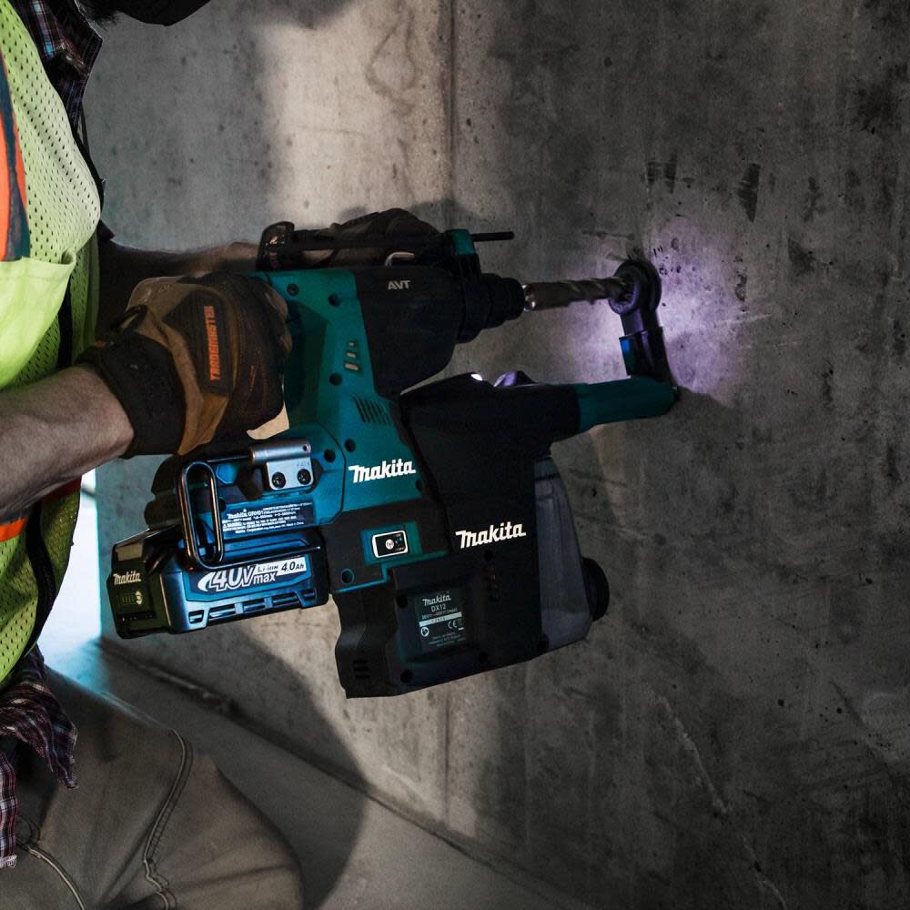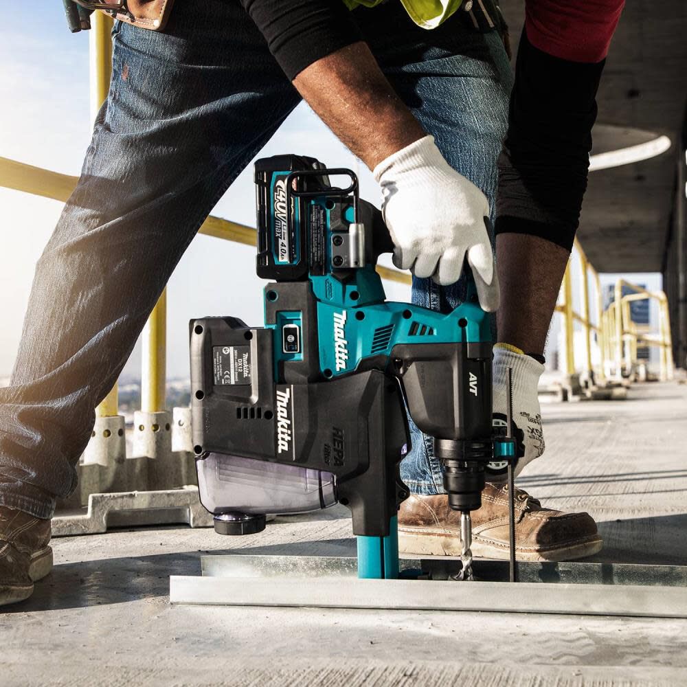 The Makita 40 Volt Max XGT® 1-1/8 Inch AVT rotary hammer kit includes charger and battery. Rotary hammer is powered by a brushless motor that delivers a full 2.8 ft-lb of impact energy, with 0 to 980 RPM and 0 to 5000 BPM. The XGT® technology delivers up to 135 of 3/8 Inch holes per charge when using one 40 Volt max XGT® 4.0 Amp-hour battery. Active feedback-sensing technology which electronically turns off the motor if rotation of bit is suddenly forced to stop and Anti-Vibration Technology (AVT®) for reduced vibration. Internal counterbalance of the Anti-Vibration Technology utilizes air pressure in order to move counterweight pistons in the exact opposite direction of the drive piston thus minimizing vibration of the tool. It offers enhanced durability in harsh job site conditions. The vibration-absorbing back handle and side handle minimizes vibration thereby reducing user fatigue.