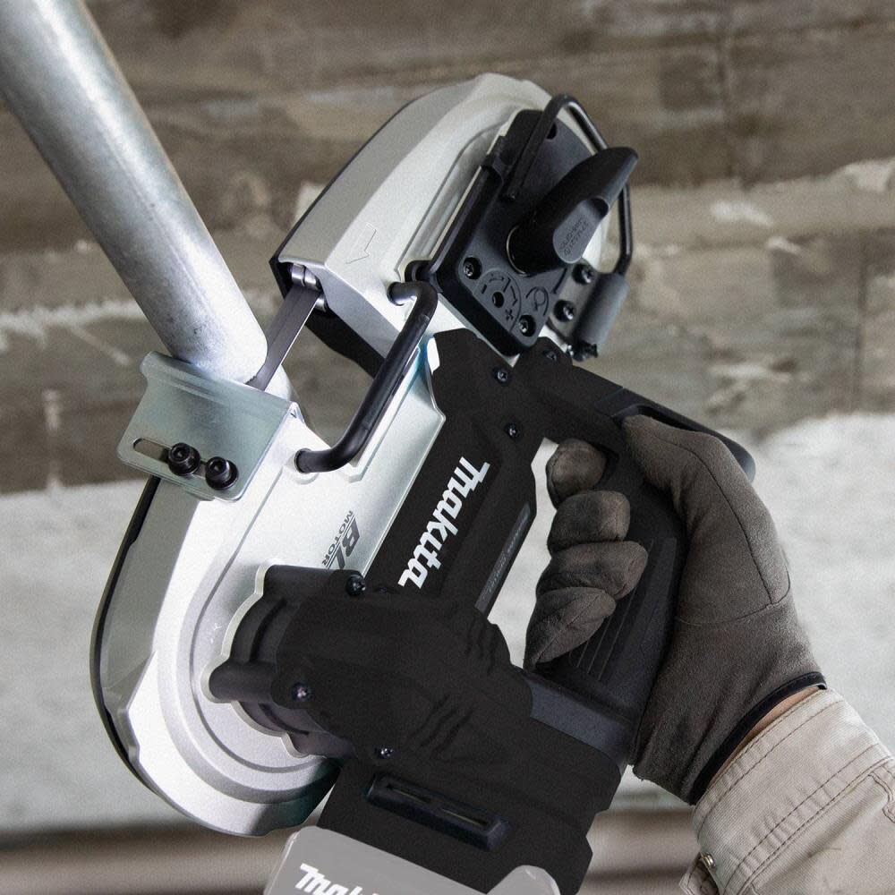 The Makita 18V LXT® Sub-Compact Cordless Band Saw is designed for one-handed operation in confined spaces and overhead applications. The band saw is powered by a brushless motor that delivers 160 cuts of 3/4″ EMT in one full charge. It comes with a LED light that illuminates your work area in low light conditions. Overload protection safeguards the motor from burnout in any high torque situations. Die-cast aluminum gear and blade housing ensures durability and high cutting stability. The cordless saw has 2 x 2″ cutting capacity and is ideal for cutting multiple materials. Constant speed control automatically applies extra power to the motor to maintain speed under load during challenging jobs. The blade tracking dial allows to adjust for enhanced cutting performance quickly. Protect from overloading, over-discharging and over-heating with Star Protection Computer Controls™. A tool-less blade change lever ensures easy installation and minimal downtime. Additionally, the catch bar helps overcomes accidental follow through during repetitive cutting.