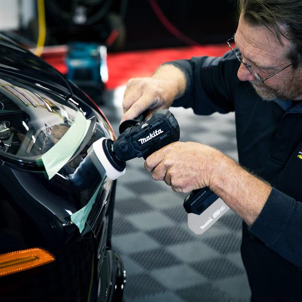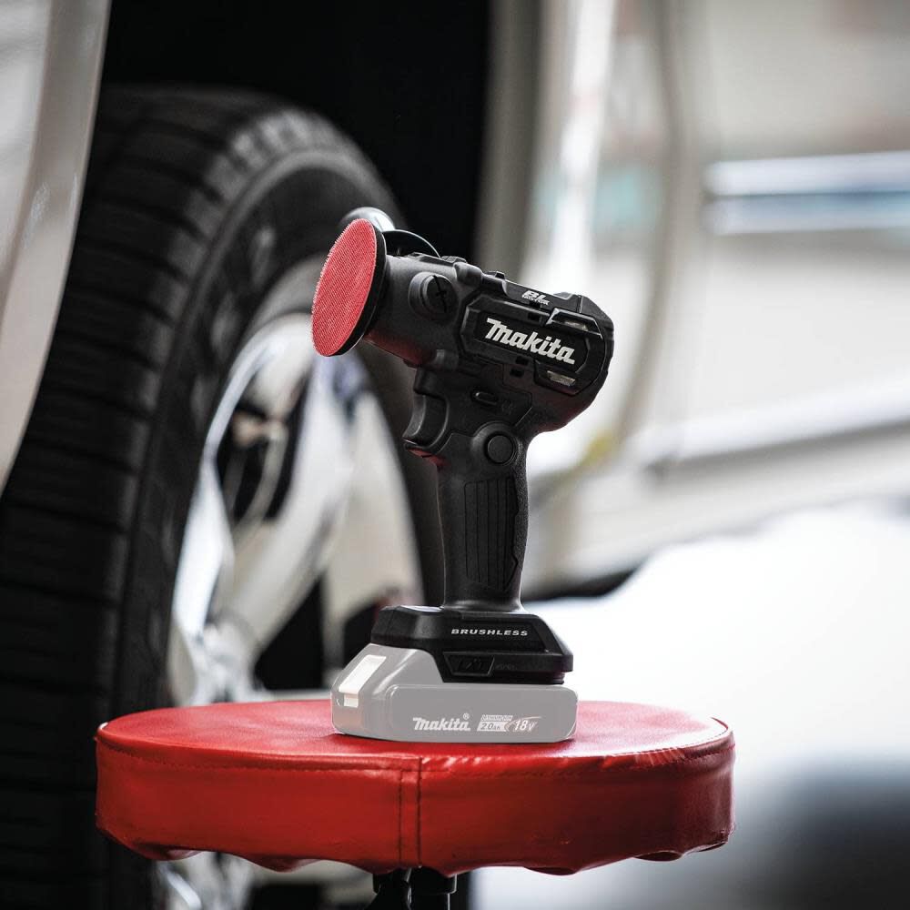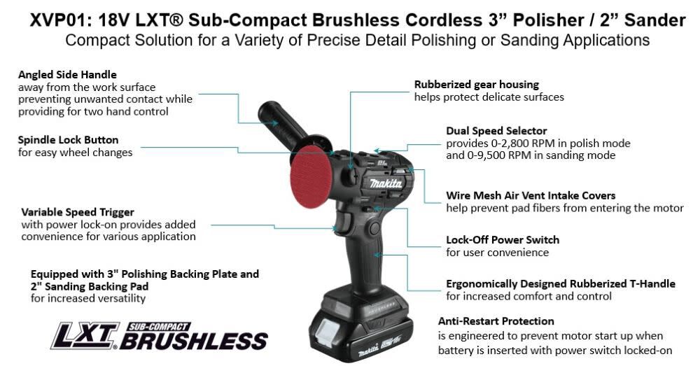 The 18V LXT® Sub-Compact Brushless Polisher/Sander (XVP01ZB, tool only) is a compact solution for precise detail polishing or sanding applications. A dual speed selector provides 0-2,800 RPM in polish mode and 0-9,500 RPM in sanding mode. A variable speed trigger with power lock-on provides added convenience. The brushless motor enables the motor to run cooler and more efficiently for longer run time performance and rubberized gear housing helps protect delicate surfaces. The polisher/sander features Anti-restart protection, which engineered to prevent motor start up when the battery is inserted with power switch in locked-on position. It’s part of Makita’s expanding 18V LXT System, the world’s largest cordless tool system powered by 18V lithium-ion slide-style batteries. Makita® 18V LXT® Lithium-Ion Batteries have the fastest charge times in their categories, so they spend more time working and less time sitting on the charger. For improved tool performance and extended battery life, Makita created Star Protection Computer Controls™. Star Protection is communication technology that allows the Star Protection-equipped tool and battery to exchange data in real time and monitor conditions during use to protect against overloading, over-discharging and overheating. For increased versatility, the tool can also be powered by Makita® 18V LXT® Lithium-Ion Batteries with the star symbol on the battery indicating Star Protection inside.