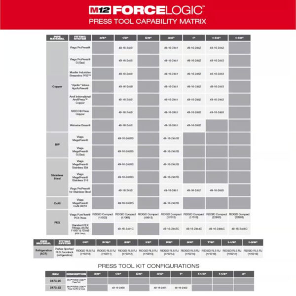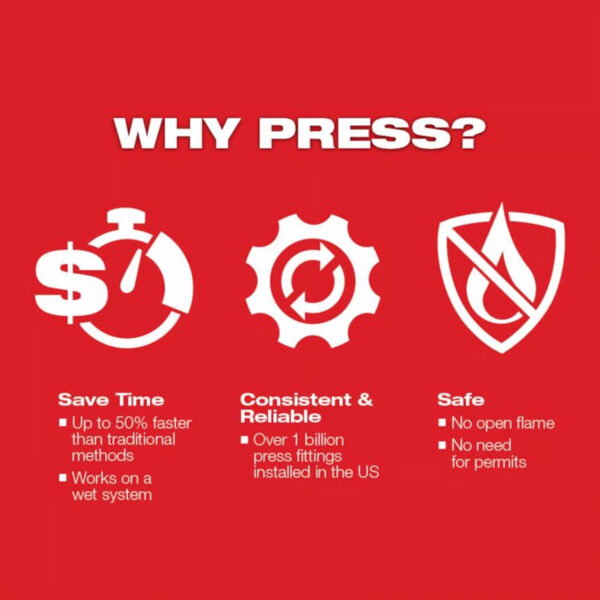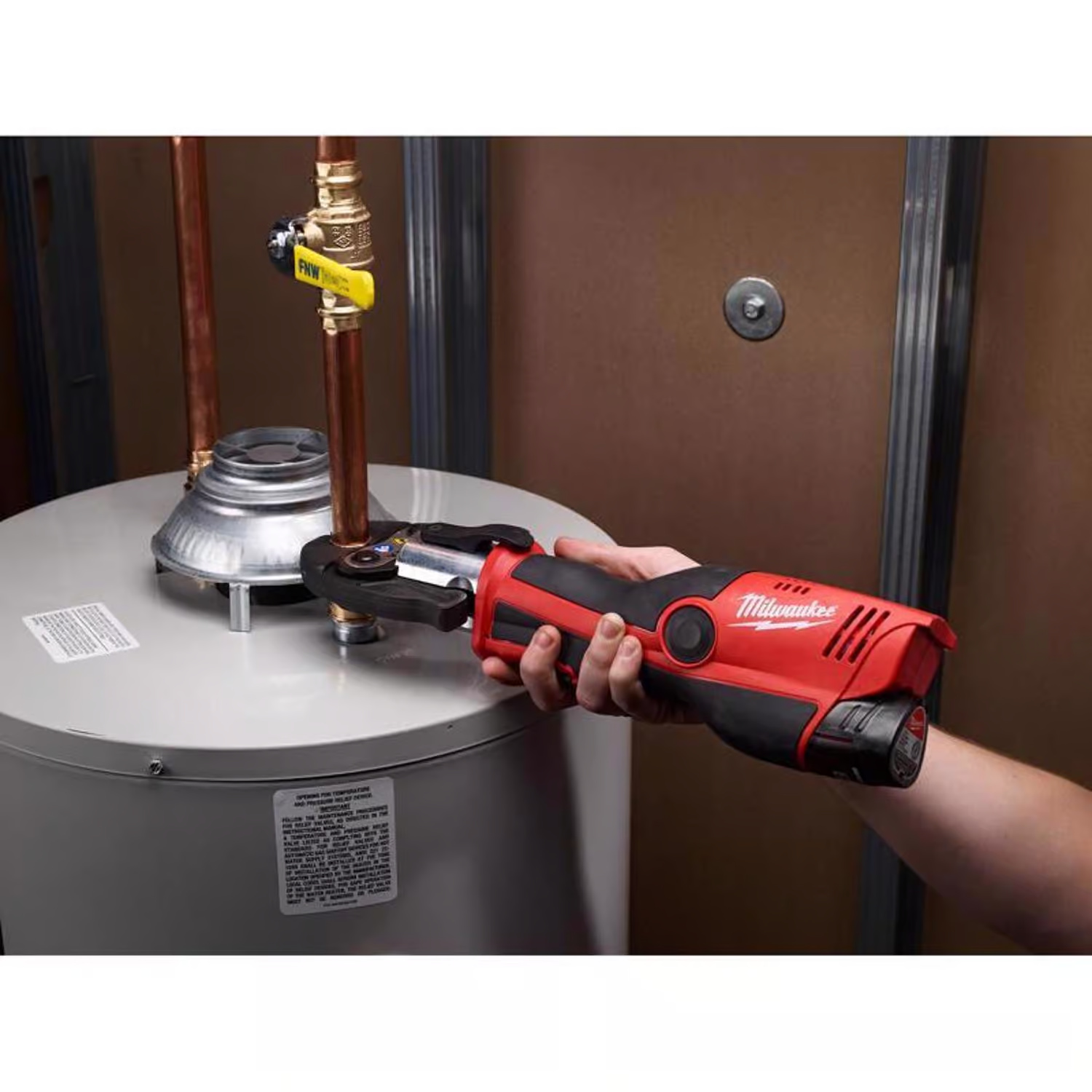 The Milwaukee M12 Force logic press tool kit with Jaws is the lightest press tool on the market and represents a new level in portability and accessibility around the installed pipe. The M12 press tool features a one-handed, in-line design enabling you to operate the tool nearly anywhere you can fit your arm. Built-in Redlink technology enables the plumbing press tool to monitor the force output, delivering you with quality connections. A visual indicator alerts you when a secure connection has been achieved and when the tool needs calibration. The cordless press tool features the best calibration standards, only requiring service every 32,000 crimps. This allows you to perform up to 4X more connections between services, keeping the tool on the job site up to 4X longer than competitive units. When used with our Milwaukee press jaws, this tool delivers quality press connections on all major fitting brands. Our Force Logic press tool is powered by Milwaukee M12 Redlithium batteries, allowing you to cut, fasten, and connect on one system.