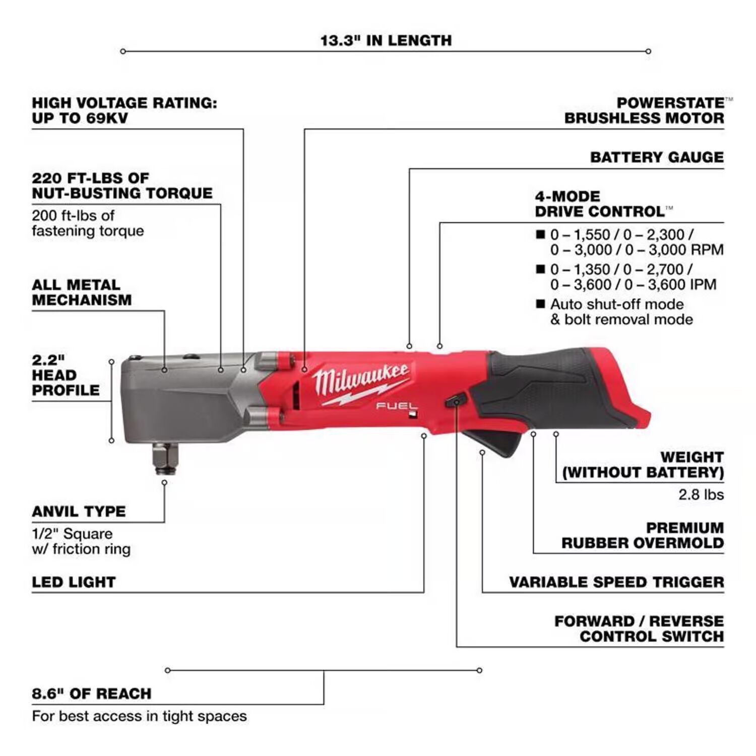 The Milwaukee M12 Fuel 1/2 in. Right Angle Impact Wrench with Friction Ring is the industry’s most powerful right-angle impact wrench. It will be easy to remove stubborn bolts and fasteners with up to 220 ft.-lbs. of nut-busting torque without kickback. This cordless right angle impact wrench also gives you maximum access with ultimate control in hard to reach applications. The durable cordless impact wrench easily fits into tighter spaces than traditional pistol-grip impact wrenches with a profile head of only 2.2 in. This allows you to be more productive by decreasing your need for socket extensions often used with pistol-grip impact tools. The 4-Mode Drive Control delivers unmatched control in various fastening and bolt removal applications. Modes 1-3 provide RPM and IPM adjustments for maximum precision, and Mode 4 is equipped with Auto Shut-off in forward and Bolt Removal Mode in reverse. Auto Shut-off Mode will prevent over-tightening of bolts by applying no more than 15 ft.-lbs. of torque. The M12 RedLithium Battery Packs – not included are compatible with all M12 tools, delivering more work per charge and more work over the life of the pack.