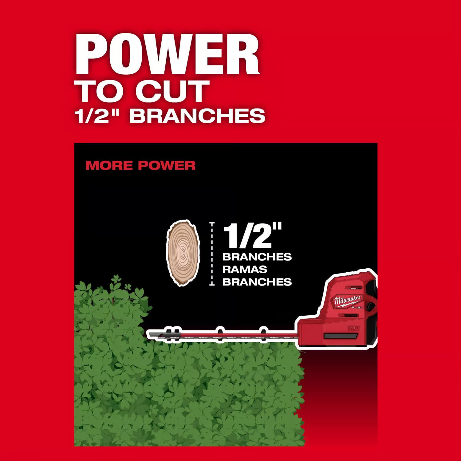 The Milwaukee M12 fuel 8 in. hedge trimmer is designed to meet the detail trimming needs of landscape maintenance professionals. Compared to a full size hedge trimmer the compact design delivers a lighter weight and one-handed use to make it easier to control in tight access applications. When running into more demanding applications the trimmer has the power to cut 1/2 in. branches while also being the fastest cutting in its class for increased application speed and overall productivity. The blade tip guard prevents damage to the property and the blades. The Milwaukee M12 fuel hedge trimmer is fully compatible with 150+ solutions within the M12 system.Increased control and access – better maneuverability than full size hedge trimmersRedlithium batteries deliver more work per charge and more work over the life of the batteryPowerState brushless motor-delivers 2700 SPM delivering the fastest cutting subcompact hedge trimmer