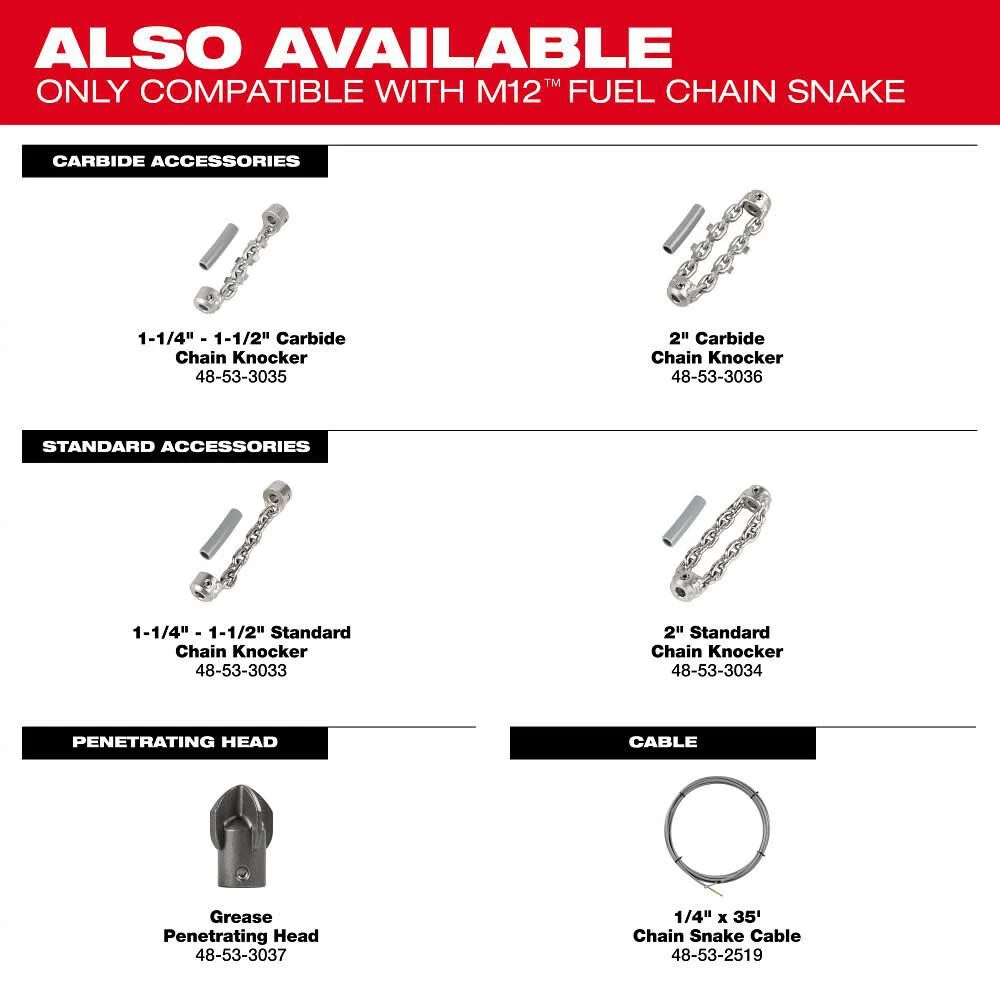 The MILWAUKEE® M12 FUEL™ High Speed Chain Snake for 1-1/4”-2” Pipes delivers the most productive, compact way to clear with instant setup. The Chain Snake provides the power to clear up to 35’ out delivering full power at max distance. The Chain Snake provides the easiest, most controlled wall-to-wall clean, featuring an infinite variable speed, an electronic foot pedal, and a mechanical clutch. Eliminate the hassle of extension cords, finding electrical outlets, and unreliable drill connections, the Chain Snake provides access to power anywhere. The included (1) M12™ REDLITHIUM™ XC6.0 batteries allow the tool to clear 70’ of build-up per charge. The M12 FUEL™ Chain Snake comes with 1-1/4” – 1-1/2” and 2” standard chain knockers to clear soft blockages and build-up. Additional accessories available: 1-1/4” – 1-1/2” Carbide (48-53-3035), 2” Carbide (48-3-3036), Penetrating Head (48-53-3037), and Replacement Cable (48-53-2519).
