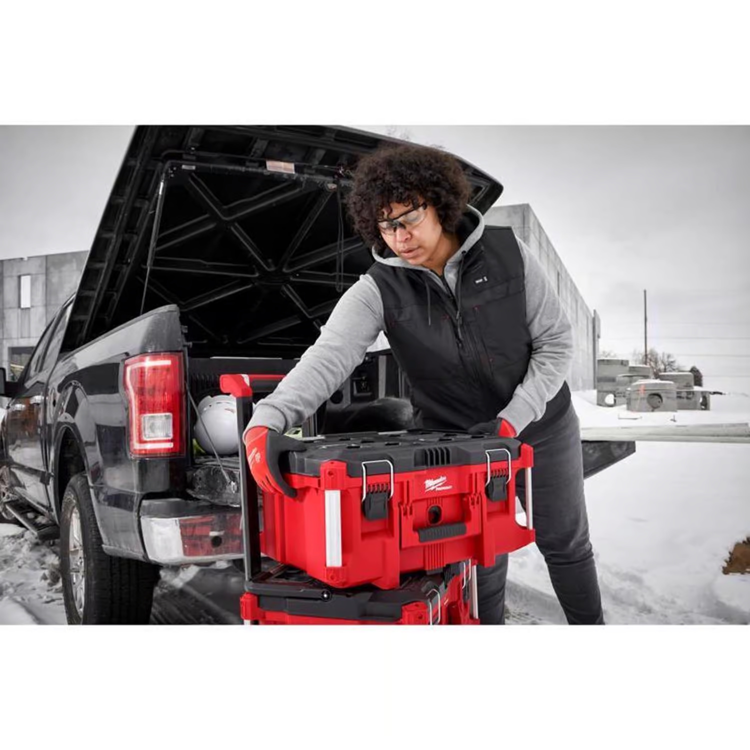The Milwaukee M12 Women’s Heated AXIS Vest is powered by Milwaukee M12 RedLithium Battery Technology, this lightweight and durable vest features an advanced heat technology system utilizing carbon fiber heating elements and Quick-Heat functionality, distributing heat 3X faster than market competitors to the chest and back. A hidden battery pass-through pocket construction allows for front or back battery placement, increasing comfort and versatility. With re-engineered Axis Ripstop polyester fabric, this Milwaukee vest prevents tears from spreading while keeping the heat in and not adding bulk.Up to 8 hours of run-time with the M12 Redlithium CP2.0 compact battery pack on low setting (not included)One touch LED controller with 3 heat settings per zone high, medium and lowCompatible with both washers and dryers for effortless cleaning and maintenanceAdjustable waist to improve fit and comfortWind and water resistant with DWR coatingMaximized Storage with 5 Total Pockets – 2 hand pockets, 1 right chest zip pocket, 1 left chest drop pocket, 1 low-profile battery pass-through pocket for front or back placement