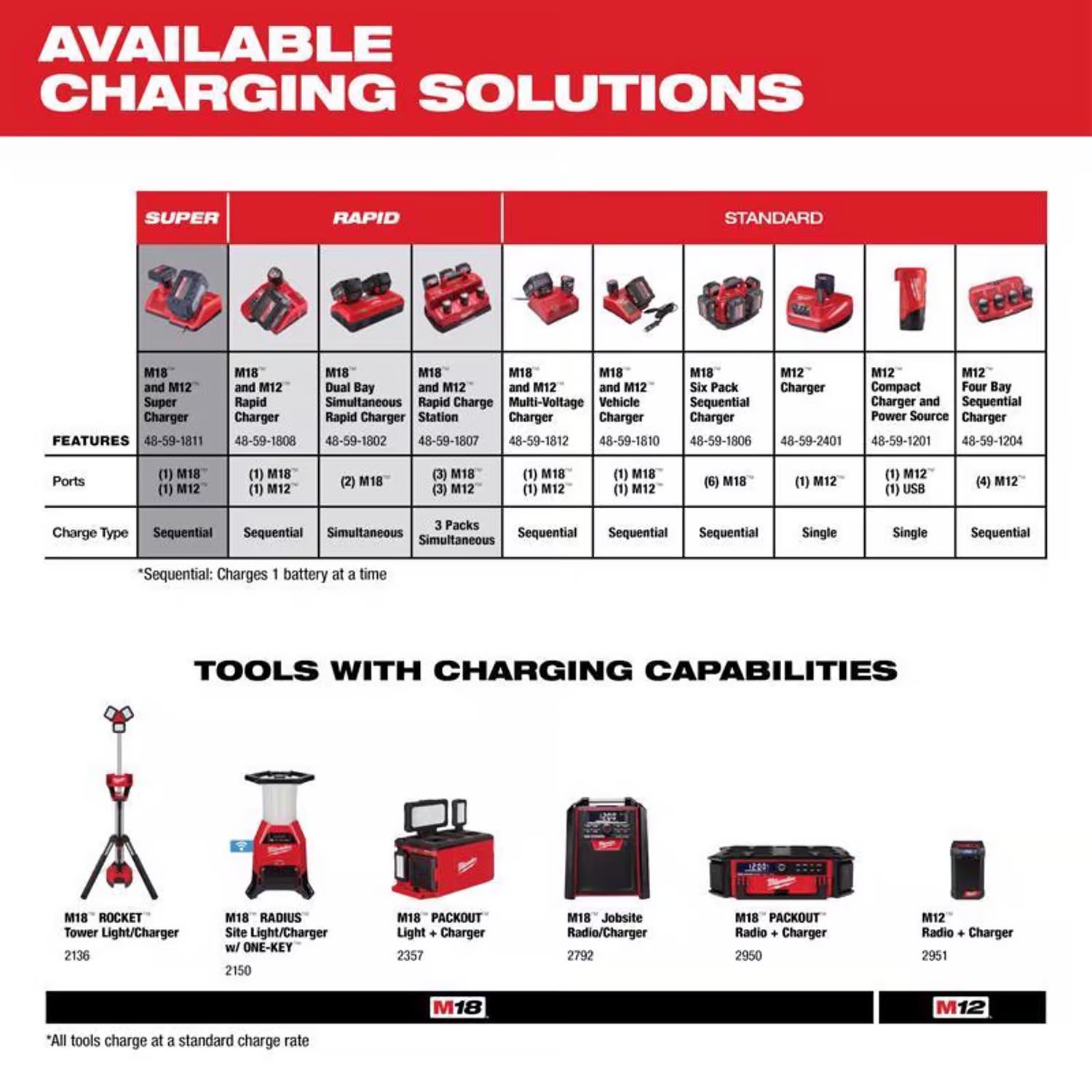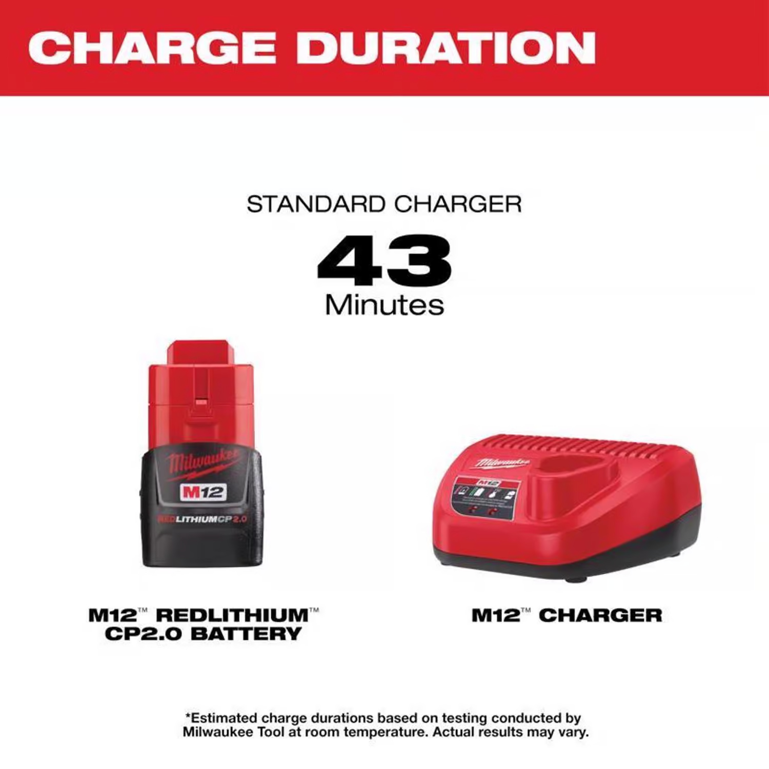 The Milwaukee M12 Charger accepts all M12 batteries, so users will always be prepared and productive. Power up compact batteries in 30 minutes and extended capacity batteries in 60 minutes, without the need for extra charges on the jobsite. The Milwaukee 48-11-2420 M12 Redlithium 2.0 provides up to 2X more run-time, 20% more power and 2X more recharges than a standard Lithium-Ion battery. Redlithium 2.0 also delivers best-in-class performance in extreme job-site conditions. With Milwaukee durability built into each pack, the Redlithium 2.0 battery operates cooler and performs in climates below -18 deg. C/0 deg. F with fade free power.