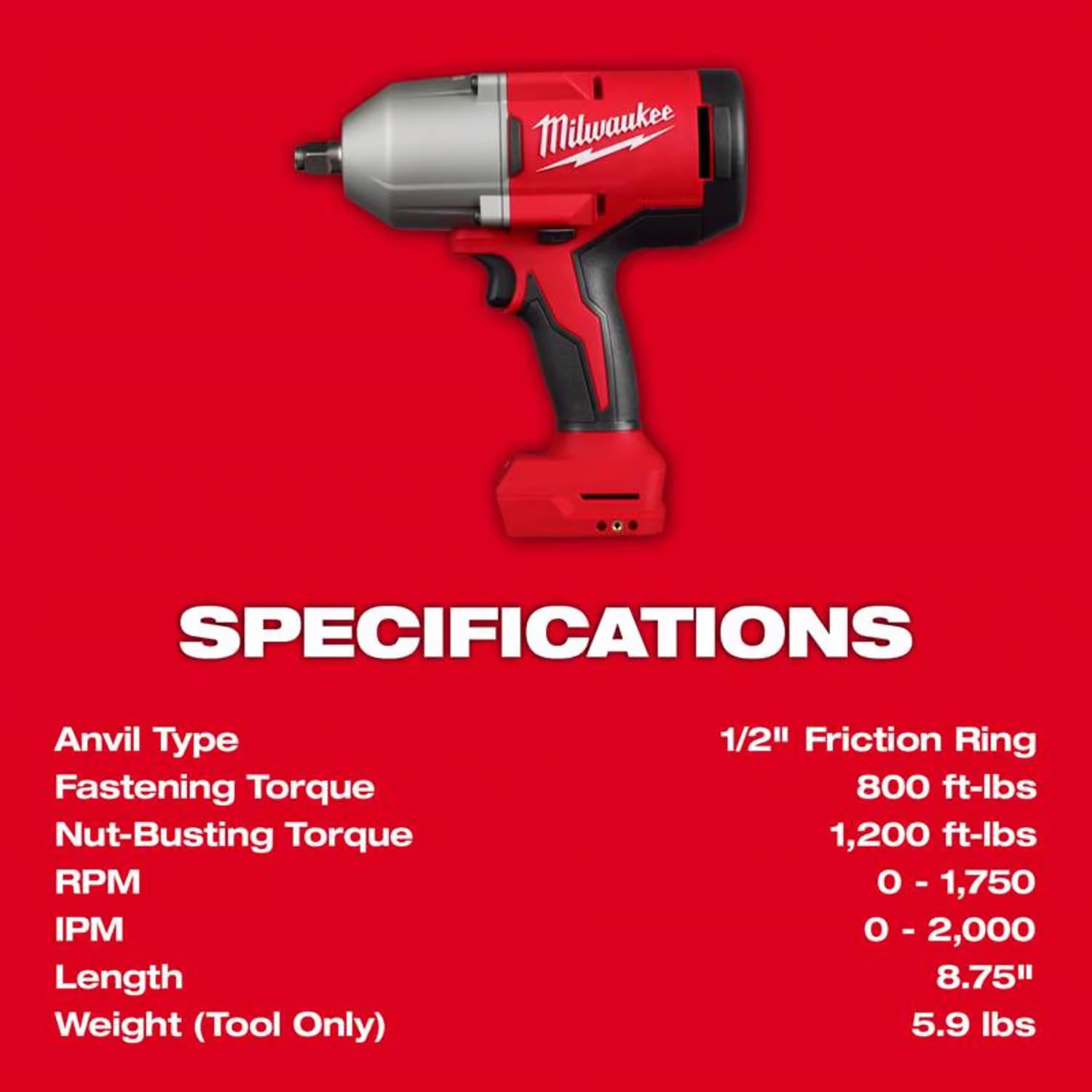 The Milwaukee M18 Brushless 1/2? High Torque Impact Wrench delivers faster driving speeds and increased productivity without the hassle of a cord. The brushless motor delivers 1750 RPMs & 2000 IPMs, optimized for driving lag bolts and concrete anchors on the jobsite. Paired with RedLink technology and REDLITHIUM batteries, the Brushless High Torque will be able to drive (35) 6? x 1/2? lag bolts into pressure-treated lumber.RedLink intelligence: provides optimized performance and overload protection using total system communication between tool, battery and chargerUp to 800 ft-lbs of fastening torque & 1,200 ft-lbs of nut busting torqueThe 1/2 inch friction ring anvil allows quick one handed socket changesBrushless motor delivers maximum power and long motor lifeThe variable speed trigger allows for 0 – 1,750 RPM & 0 – 2,000 IPM for maximum controlIntegrated LED Light