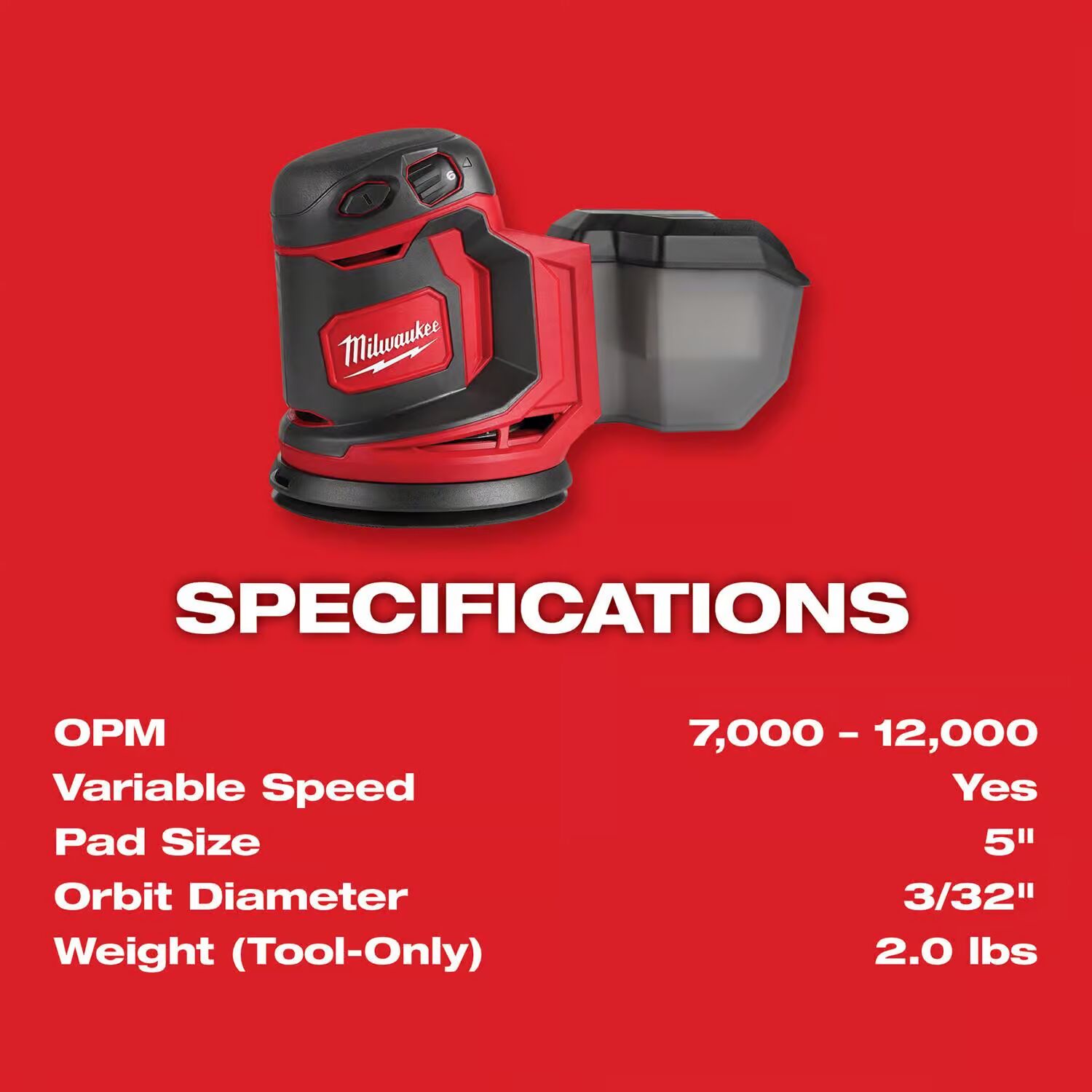 The Milwaukee M18 5 in. random orbit sander delivers corded power with 12,000 Max OPM output. The orbital sander features a 7,000-12,000 variable speed dial delivering more control over the output of the tool to match the orbit speed for the application. The tool’s powerful motor removes more material per battery charge, increasing productivity. The cordless orbital sander is powered by the Milwaukee Redlithium battery technology, delivering up to 35 minutes of run-time on an M18 Red Lithium XC3.0 Battery Pack.