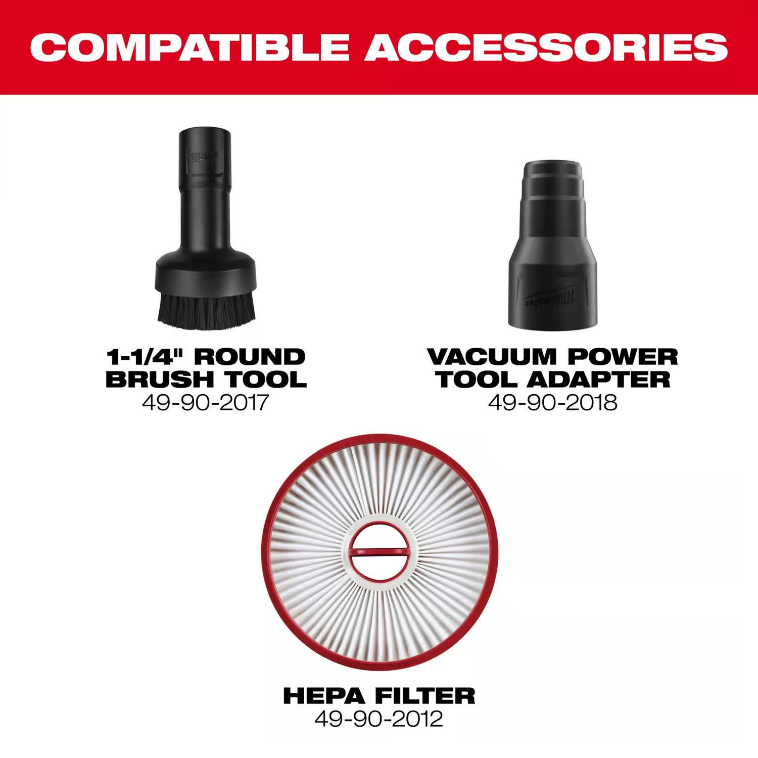 SpecificationsBrand Name:MilwaukeeSub Brand: M18 FUEL Product Type: Hand VacuumAir Volume: 32 CFMBrand Name: MilwaukeeCapacity: 0.25 gallon (US)Casters Included: YesColor: Black/RedCorded or Cordless: CordlessFilter Type: HEPA FilterHeight: 11.65 inchHose Diameter: 1-1/4 inchHose Length: 6 footModel Number: 0940-20Style: CompactSub Brand: M18 FUELTank Material: PlasticVolts: 18 voltWeight: 4.35 poundWidth: 6.39 inchBuilt-In Accessory Storage: NoBuilt-In Drain: NoHose Adapter Included: YesBlower Port: NoKit or Tool Only: Tool OnlyWhat’s Included:(1) M18 FUEL Compact Vacuum (0940-20), (1) Extension Wand, (1) Powered Floor Tool(1) Floor Tool, (1) 6′ Flexible Hose, (1) Crevice Tool, (1) Utility Tool, (1) Brush Tool, (1) Accessory Holder, (1) M18 FUEL Compact Vacuum HEPA Filter (49-90-2012), (1) FoamClick here to see the Safety Data Sheets for this product.SHOW MORE