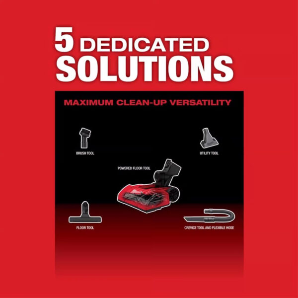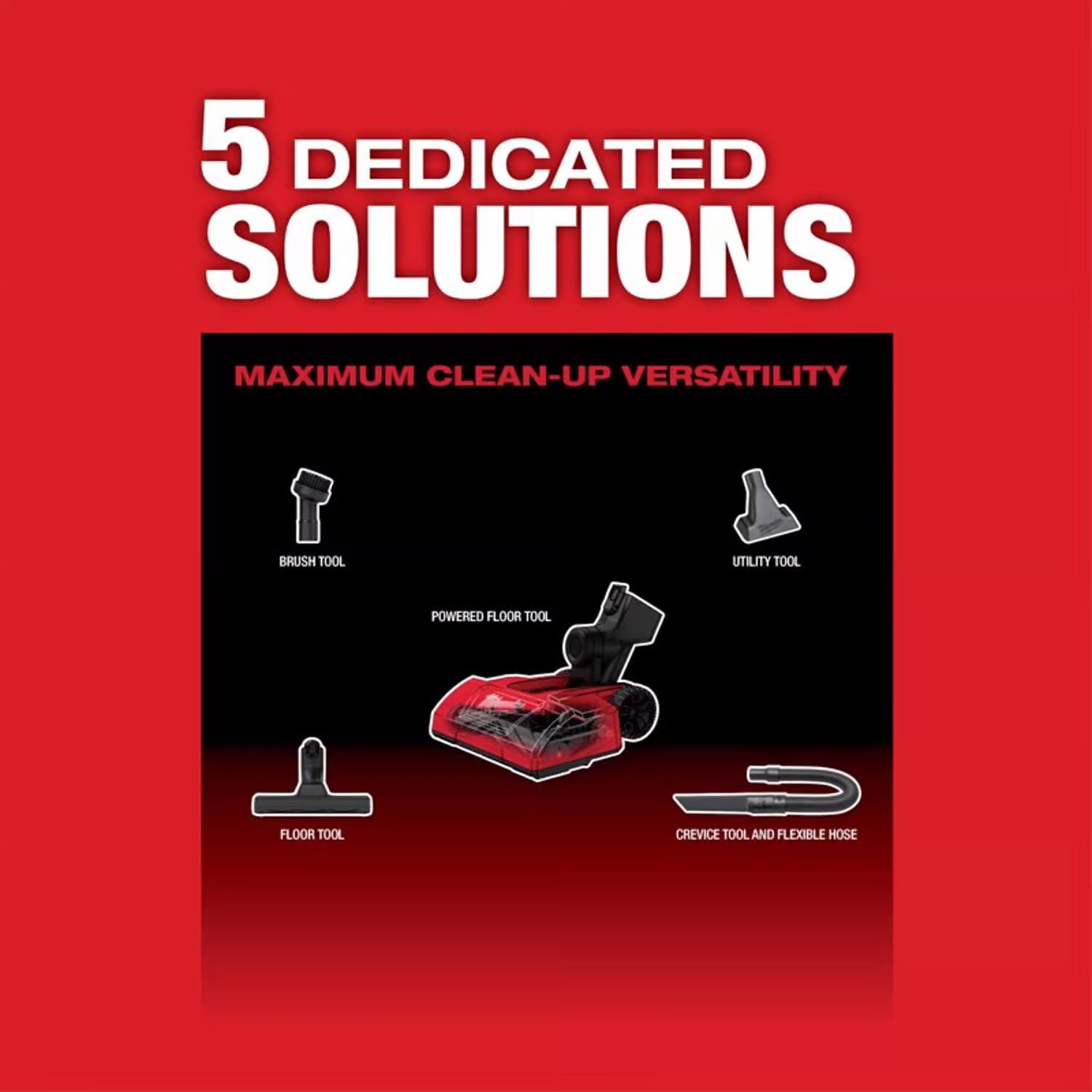 The Milwaukee M18 Fuel compact vacuum provides powerful performance and ultimate versatility to excel in small-area and spot clean-up applications on the jobsite. Armed with a Powerstate Brushless Motor and exclusive two-stage debris separation, the compact shop vac is optimized for dry jobsite debris. This provides with up to 50% more sustained suction versus the competition and more efficient clean-up. The two-stage debris separation divides small and large particles into the bagless canister prior to entering the filter. For maximum versatility, the portable vacuum orientation and quick-change accessories can be manipulated from upright use at ground level, waist level or for use overhead. It comes fully equipped with an extension wand, powered floor tool, floor tool, flexible hose, crevice tool, utility tool, brush tool, accessory holder, HEPA filter, and foam pre-filter.Compatible with all M18 batteriesMaximum versatility – five dedicated accessory solutionsRedlink plus Intelligence – ensures optimal performance and maintains compatibility across the entire M18 SystemRemoveable canister for easy emptying of debris on or off toolHigh / low switch for easy accessTwo-Stage dry debris separation optimized for dry jobsite debris