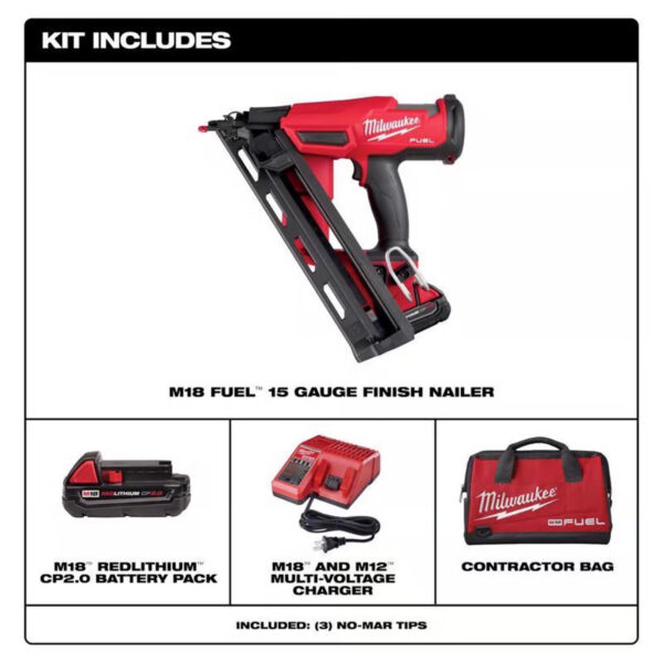 The Milwaukee M18 Fuel finish nailer kit provides peak productivity on the jobsite, delivering unmatched nailing performance without the hassle of a compressor and hose. Leveraging a nitrogen air spring mechanism, this finish nailer consistently sinks nails to the required depth in hard and softwoods while leaving clean nail holes, making for repeatable results and easy filling. The nitrogen air spring mechanism, combined with Milwaukee Powerstate brushless motor and Redlink plus Intelligence, delivers a pneumatic-like nailing response with zero ramp-up time from nail to nail for productive and efficient jobs. This Milwaukee cordless finish nailer features a compact and ergonomic design providing access into tight spaces where nailing is required while limiting fatigue when using the tool. When paired with an M18 Redlithium CP2.0 battery pack, this finish nail gun fires up to 750 nails per charge and is fully compatible with all M18 Redlithium batteries. The M18 FUEL 15 gauge finish nailer kit delivers the pneumatic performance that professional carpenters and remodelers demand with finishing nails for trim, crown molding, baseboards and more with the freedom and convenience of cordless.