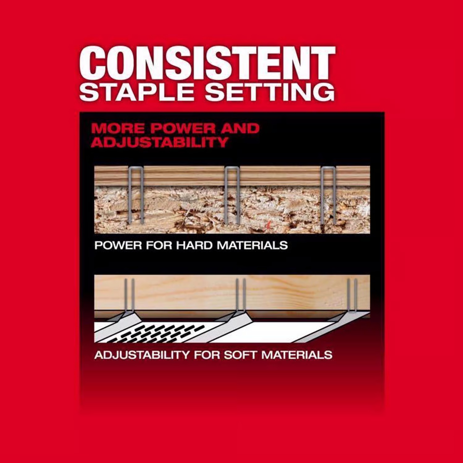 The Milwaukee M18 Fuel 18ga 1/4 in. Narrow Crown Stapler delivers peak productivity, providing users with unmatched stapling performance without the hassle of a compressor and hose. A nitrogen air spring mechanism gives this cordless staple gun power to consistently sink staples to the proper depth in hard materials with the ability to adjust to drive staples in soft materials without blowing through. The combination of a Powerstate brushless motor and Redlink plus intelligence provides an unmatched fire rate with zero ramp-up time, keeping users efficient throughout the day. The M18 Fuel 18ga 1/4 inch Narrow Crown Stapler delivers the pneumatic performance that professional carpenters and remodelers expect with the freedom and convenience of a cordless tool.
