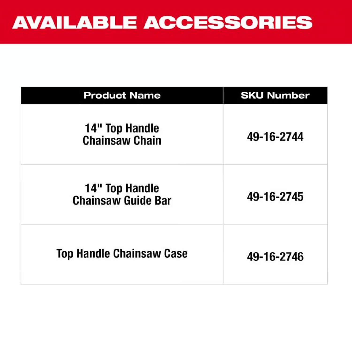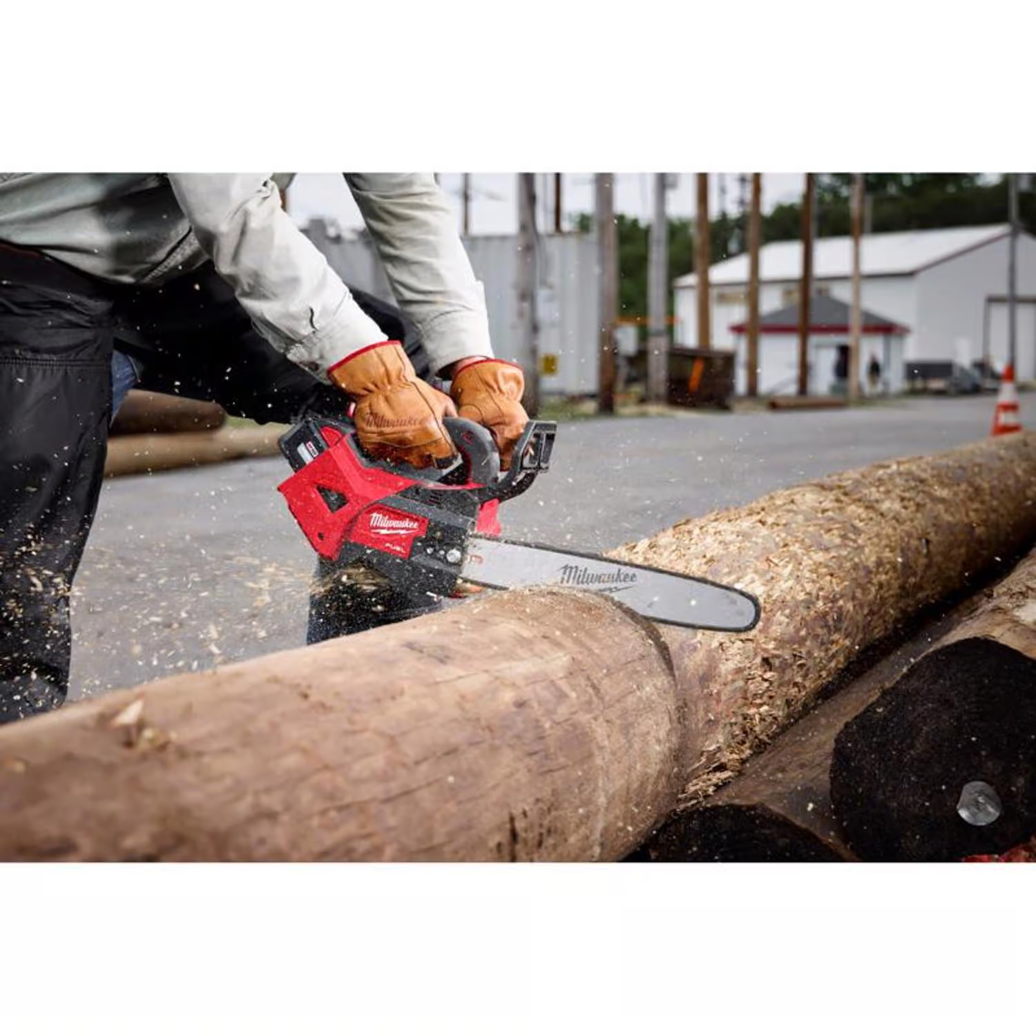 The Milwaukee M18 Fuel 14 in. Top Handle Chainsaw delivers the power to cut faster than gas and delivers up to 180 cuts per charge. The unit is designed to meet the performance, durability and ergonomic needs of professional tree service and power utility. The Powerstate Brushless Motor maintains speed under heavy loads without bogging down to outperform gas engines and higher voltage systems. Redlink Plus intelligence ensures maximum performance and protection from overload, overheating and over discharge. When paired with the M18 Redlithium High Output XC8.0 battery (sold seperately), the unit delivers unmatched run-time in all applications. M18 Fuel technology allows the unit to reach full throttle in under 1 second providing ultimate control and productivity.