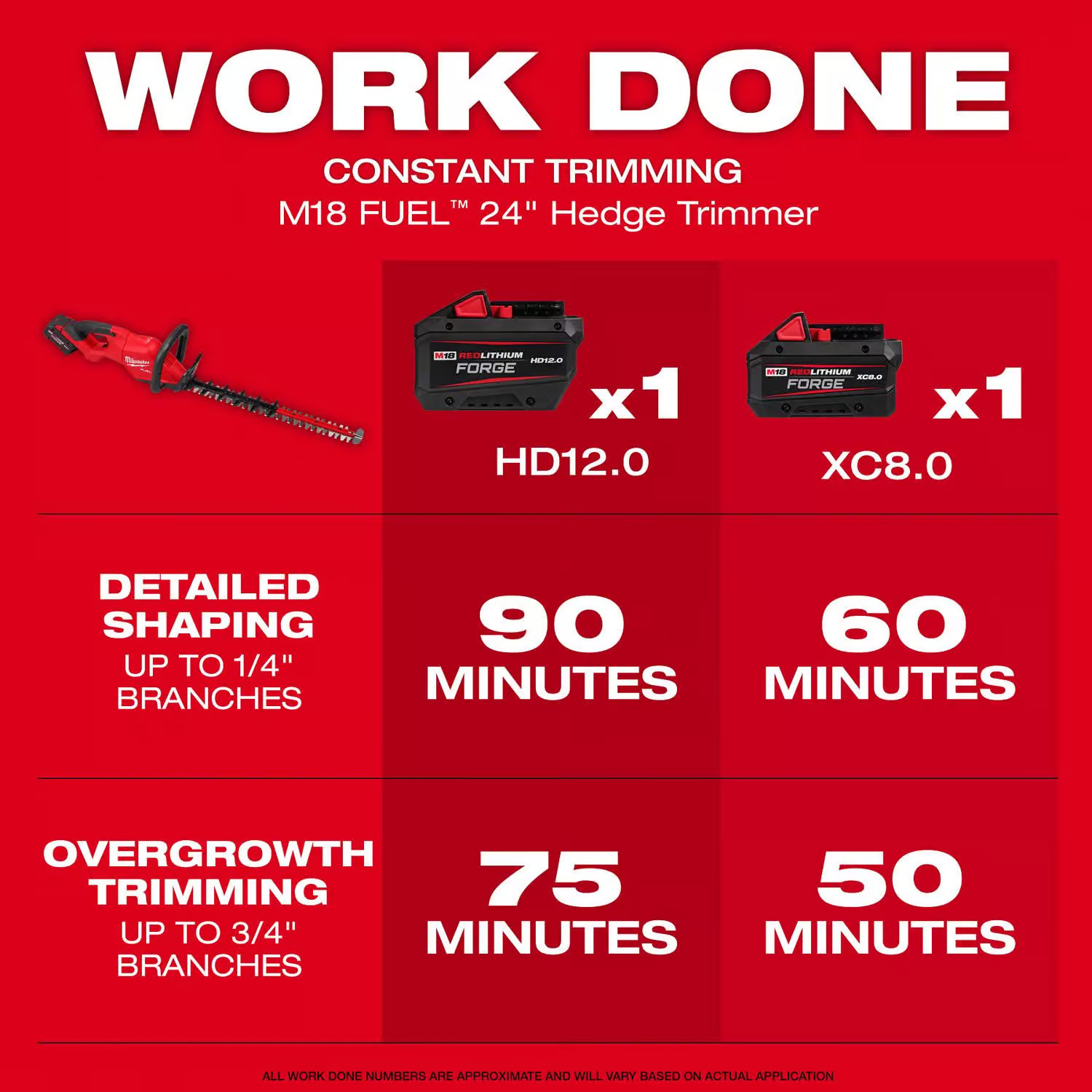 The MILWAUKEE M18 FUEL 24 in. Hedge Trimmer exceeds the power, performance, and durability needs of the landscape maintenance professional. The POWERSTATE Brushless Motor provides users the power to cut up to 1-1/4″ branches to complete aggressive cut-backs and allow for faster trimming. This hedge trimmer features a rotating handle, double-sided blades, and clippings sweep attachment, providing you with more control for clean cuts. REDLINK PLUS Intelligence offers total system communication between tool and battery for unmatched levels of performance, protection, and productivity. The M18 FUEL 24 in. Cordless Hedge Trimmer is fully compatible with 275+ solutions on the M18 System.