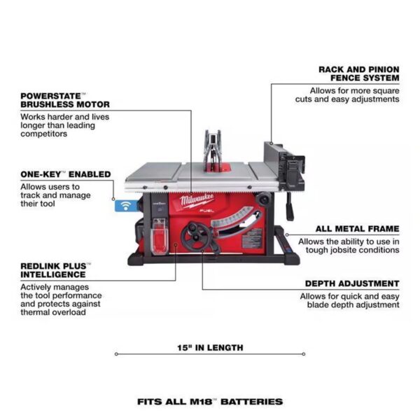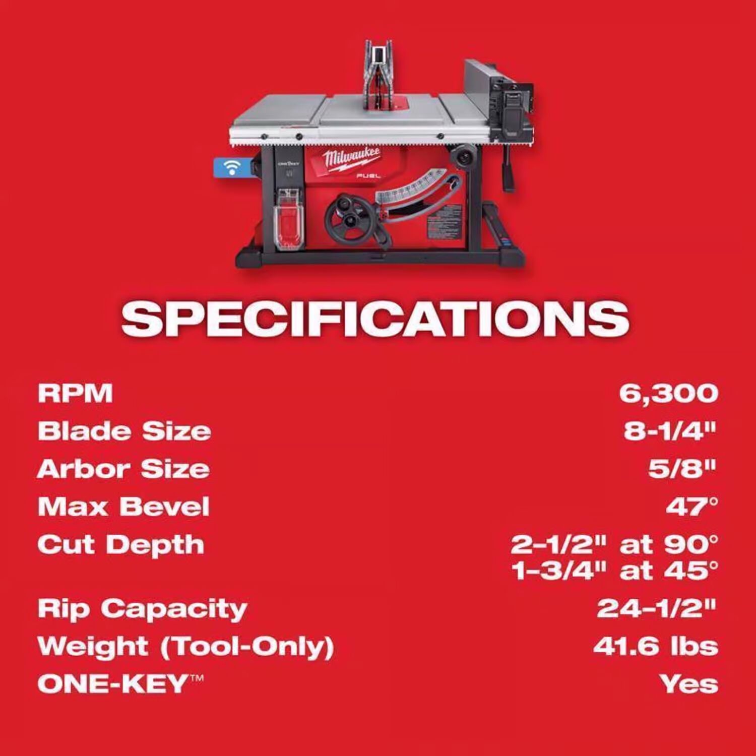The Milwaukee M18 FUEL 8-1/4 in. Table Saw w/ One-Key Kit is a cordless, professional-grade table saw that is designed for portability and productivity. It is powered by a brushless motor that delivers the power of a 15 A corded saw, and it has a rip capacity of 24-1/2 in. The table saw also features ONE-KEY technology, which allows you to track and manage the tool’s performance and location using a smartphone or tablet.