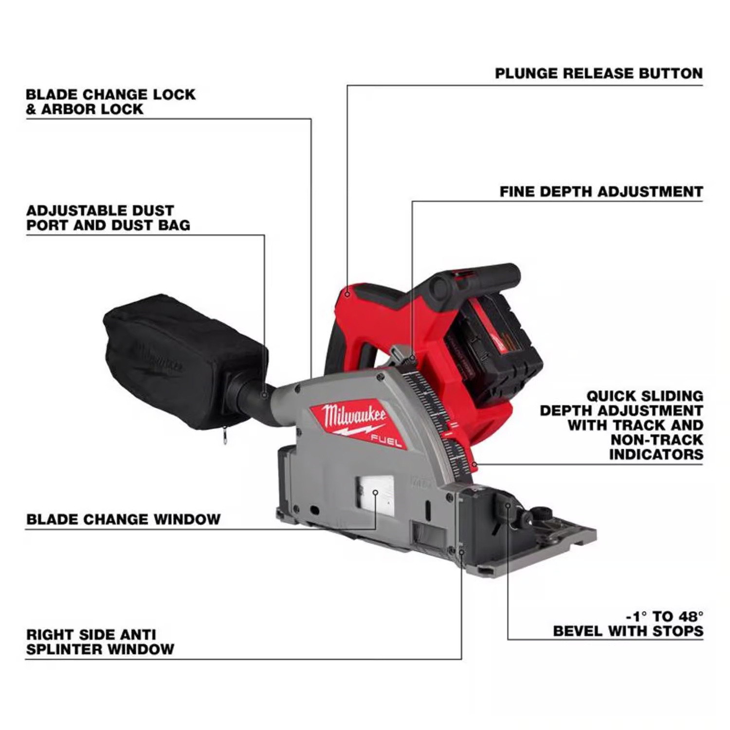 Designed for the professional carpenter and remodeler, the M18 Fuel 6-1/2 in. Plunge Track Saw from Milwaukee delivers the Power to rip solid hardwoods, over 90% dust collection efficiency while providing the portability and precision users demand from a plunge saw. The Powerstate Brushless motor provides 6,300 RPM for finish quality and clean cuts. RedLink PLUS intelligence ensures maximum performance and protection from overload, overheating, and over-discharge. The M18 RedLithium High Output XC6.0 battery delivers more cuts per charge and great durability than the competition. The saw features a variable speed dial allowing for setting the speed of your application.RedLithium HD packs – superior pack construction provides the industry’s best protection against jobsite conditionsPowerstate brushless Motor purposely built for the M18 Fuel Track Saw to provide the power and speed to complete demanding applications with finish quality cutsThe smooth, pivoting plunge motion allows for precision plunge cuts with an accurate depth of cutREDLINK PLUS Intelligence: Ensures optimal performance and provides overload protection to prevent damage to the tool and battery during heavy applications while still maintaining compatibility across the entire M18 System. * Variable speed dial for setting blade RPM to your application * Adjustable cam system allows user to dial in track to rail fitment for laser straight cuts * Riving knife keeps materials from pinching on blade and reduces kickback * Easy slide depth stop allows for quick and accurate adjustments * * Onboard allen wrench storage for easy blade changes * Bevel stops at 0, 22.5, and 45 degrees.