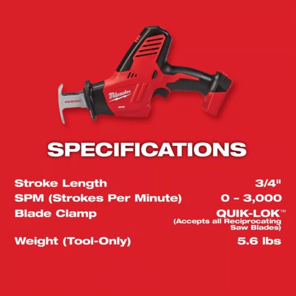 The Milwaukee M18 Hackzall One-Handed Reciprocating Saw features a dual gear anti-vibration system providing unmatched comfort and control. Its lightweight design provides superior control and versatility. The cordless reciprocating saw’s powerful motor delivers 0-3,000 strokes per minute while its 3/4 in. stroke length performs fast cuts through a wide range of material such as wood, metal and PVC. The dual gear anti-vibration system increases control and accuracy.