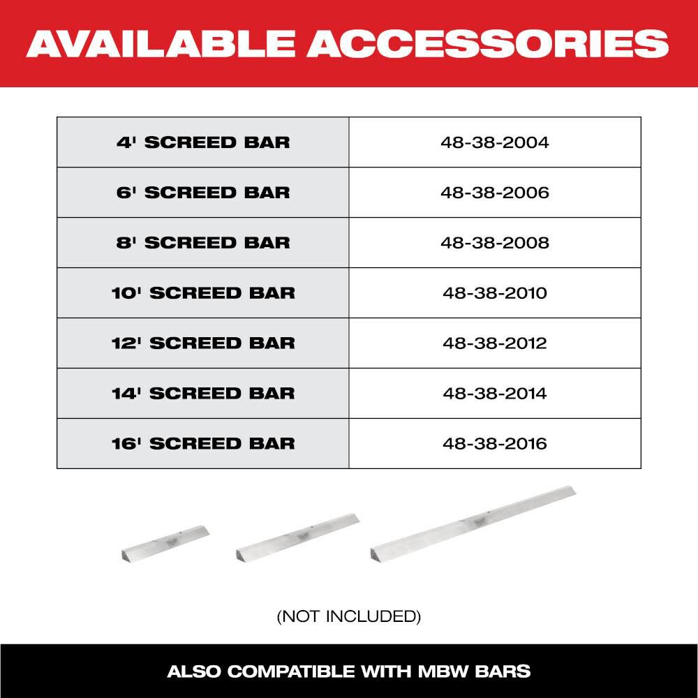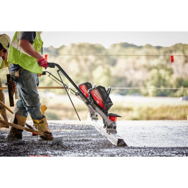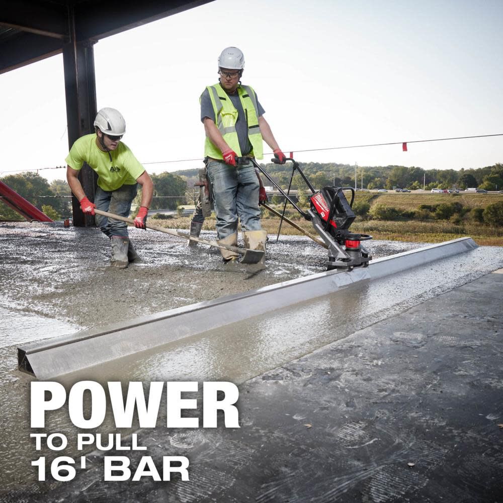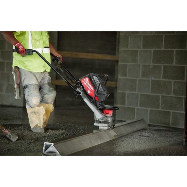 The MILWAUKEE® MX FUEL™ Vibratory Screed provides consistent starts and the most reliable pours with the power to pull up to 16 ft bars, no gas headaches, and 2 hours of runtime per charge with a 12 ft bar. The POWERSTATE™ Brushless Motor delivers the power to pull 16 ft bar at 9,000 VPM with a variable speed trigger, giving maximum control in stiff and wet concrete. The MX FUEL™ REDLITHIUM™ battery pack provides instant power with no gas headaches and requires no regular maintenance, produces less noise, and has zero emissions for a safer workspace, indoors or outdoors. The push-button start delivers instant power, eliminating the repetitive motions of a pull start and reducing downtime, allowing professionals to get jobs done faster without sacrificing the power and runtime expected. The battery-powered vibratory screed is compatible with all MX FUEL™ REDLITHIUM™ batteries, providing the hardest working and most reliable power for equipment. The MX FUEL™ Vibratory Screed can accept bars up to 16 ft long without sacrificing power and can run two motors on one bar for increased mobility. REDLINK PLUS™ Intelligence ensures optimal performance and provides overload protection to protect the machine and battery during the toughest applications. The MX FUEL™ Vibratory Screed is ONE-KEY™ Compatible – track, manage and secure equipment from a mobile device or computer using the industry’s largest Bluetooth® community tracking network. If the screed is ever lost or stolen, prevent tampering with remote lockout capability.