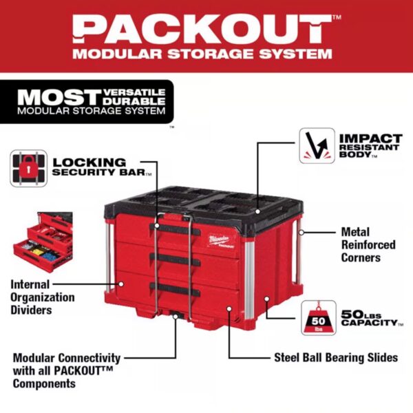 Our Packout 3-Drawer Tool Box has a 50lbs weight capacity and a locking security bar that allows you to padlock the drawers closed keeping them securely shut during transport. As part of the Packout Modular Storage, the toolbox allows you to customize your storage system for easy transportation and organization of tools and accessories. This portable toolbox with drawers is constructed with impact-resistant polymers, all-metal ball-bearing slides, and metal-reinforced corners for ultimate jobsite durability. The 3-Drawer Tool Box also allows you to customize your drawer layout with Quick-Adjust Dividers (Includes 1 set of dividers). The Milwaukee Packout Modular Storage System is the industry’s most versatile and durable storage system.