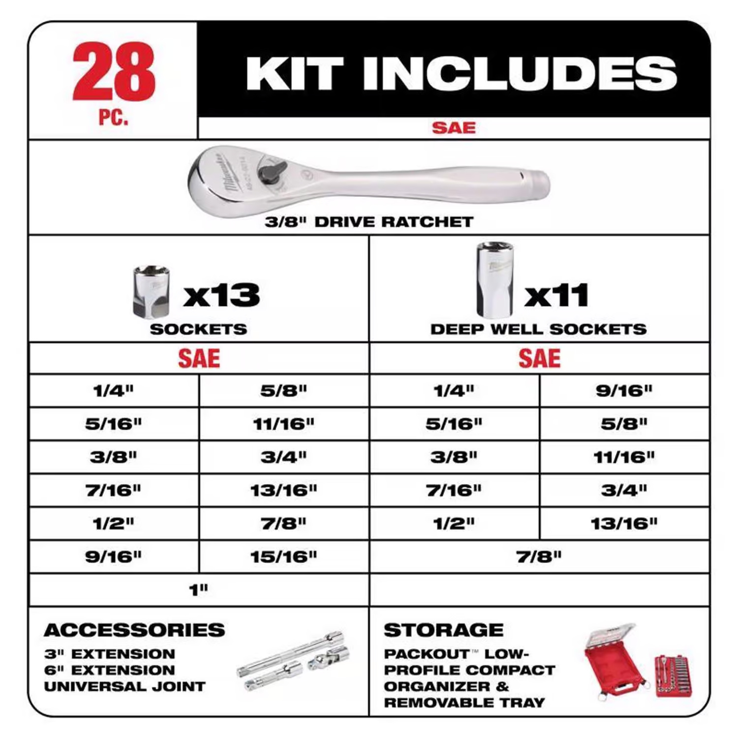Milwaukee PACKOUT 3/8 in. drive SAE 28 Piece Mechanics Ratchet and Socket Set