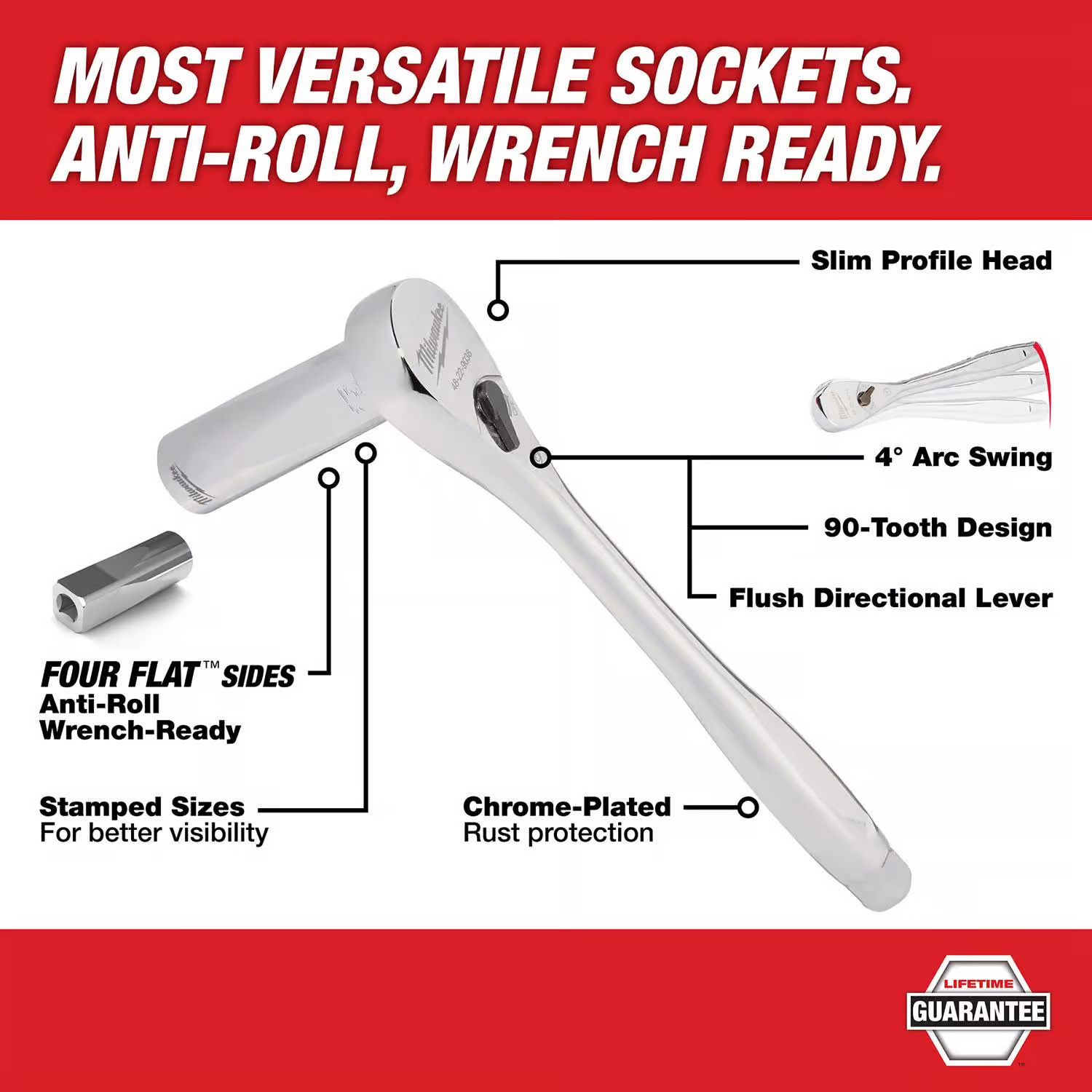 The Milwaukee ratchet and socket set features sockets that have Four Flat sides that deter rolling and are wrench compatible for maximum productivity. The 90-tooth ratchet tool that provides 4 degree of arc swing and a slim profile for work in tighter spaces. Drive ratchet and socket set organized in the included Packout compact low-profile organizer equipped with a clear top for easy identification of parts. This Packout organizer is IP65 rated and built from impact-resistant materials for durability on the jobsite with a reinforced hinge and heavy-duty latches. The compact low-profile compact organizer is part of the Milwaukee Packout modular storage system, allowing you to custom build storage systems to easily transport and organize your tools and accessories.