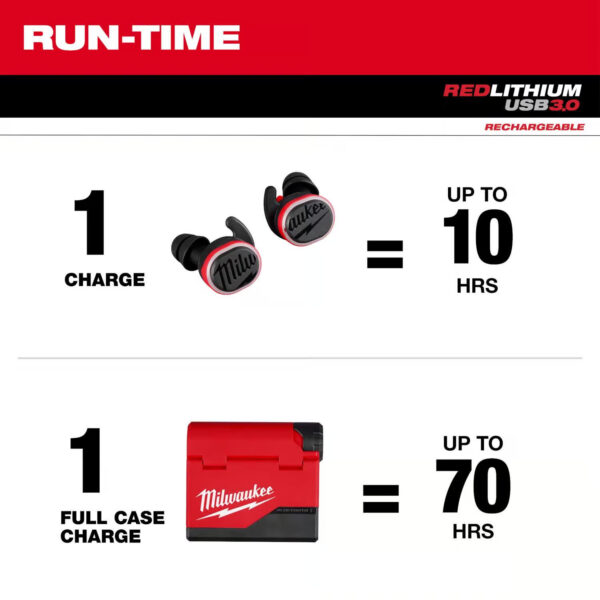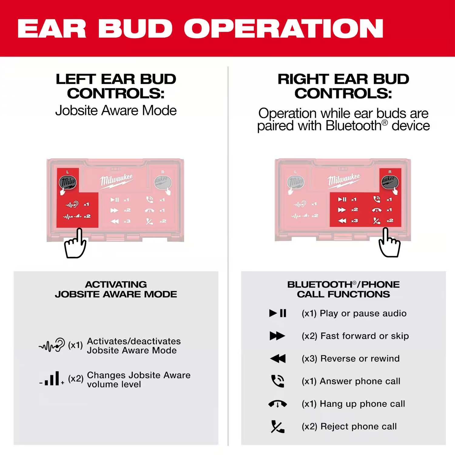 The Milwaukee Redlithium USB Bluetooth Jobsite Ear Buds deliver Uncompromised Sound, providing a powerful and balanced audio experience with the capability to take phone calls. Additionally, Jobsite Aware Mode provides situational awareness while reducing the intensity of loud external noises, allowing you to Control your Awareness. With up to 10 Hours of Runtime on a single charge, these earbuds deliver all-day runtime. The Redlithium USB case battery provides up to 70 hours of runtime using multiple in-case charges. Built to survive on the jobsite, this audio solution is water, dust, & impact-resistant. Designed for on-the-job use, passive hearing protection is provided by silicone and foam ear tips. The Milwaukee earbuds are kitted with multiple interchangeable ear tips and wings, for a secure fit. The Redlithium USB Bluetooth Jobsite Ear Buds deliver Uncompromised Sound with the ability to Control your Awareness.Bluetooth 5.1 provides up to 55 f.t of RangeControl calls and audio with easy-to-use buttonsAuto connects to prior devices out of the case for grab-and-go use
