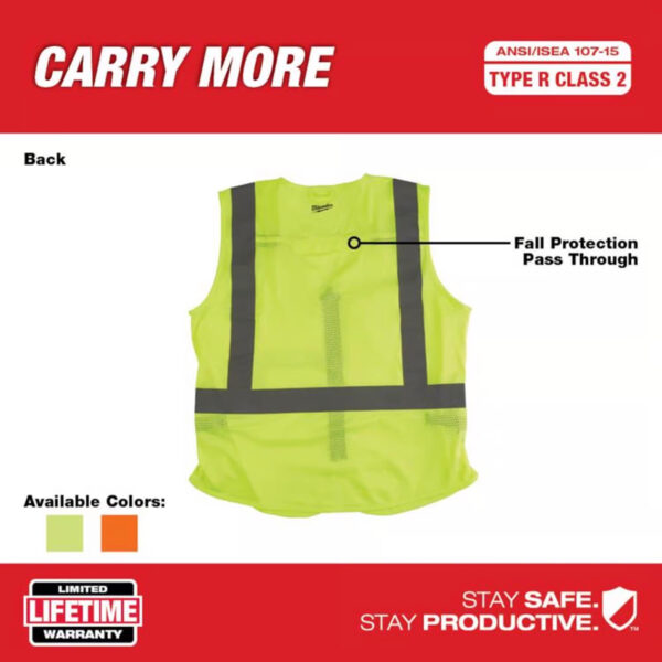 The Milwaukee ANSI Type R Class 2 High Visibility Safety Vest is designed to carry more. The high visibility safety vest has includes a clear ID holder and internal pocket, equipping users with added storage. These safety vests feature a durable pass-through slit for fall protection gear. The zipper closure delivers you ultimate jobsite security. Class 2 high visibility reflective safety vests are recommended when working in environments with traffic traveling under 50 mph or when working around heavy machinery. This includes construction, road construction, traffic direction, utility crews, and survey crews.