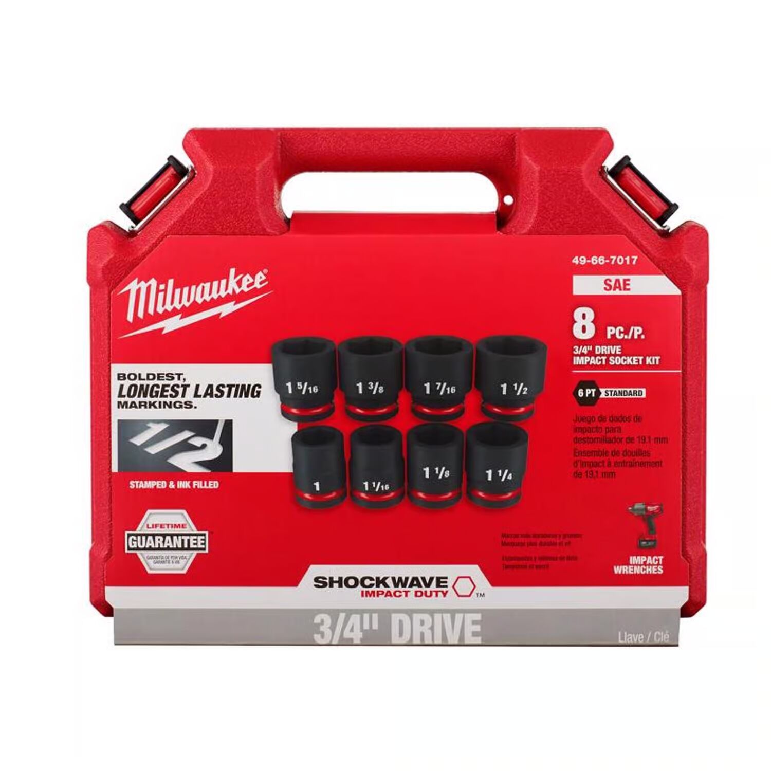 The Milwaukee shockwave impact duty 3/4 in. drive 6 point socket sets feature the boldest, longest lasting markings and extreme impact durability in high torque applications. The stamped and ink-filled size marking enables you to select the right socket every time throughout the life of the socket. These sockets are engineered with high-strength forged steel for optimized performance in heavy-duty applications. The non-slip hex geometry prevents fastener rounding, and a dual-hole design and ring groove allow for easy socket attachment and removal. The storage cases are impact resistant and nest together for easy stacking and storage.