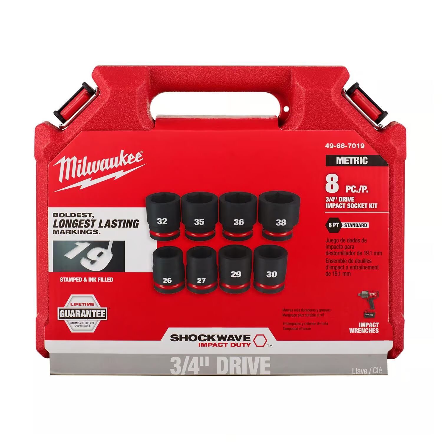 The Milwaukee shockwave impact duty 3/4 in. drive 6 point socket sets feature the boldest, longest lasting markings and extreme impact durability in high torque applications. The stamped and ink-filled size marking enables you to select the right socket every time throughout the life of the socket. These sockets are engineered with high-strength forged steel for optimized performance in heavy-duty applications. The non-slip hex geometry prevents fastener rounding, and a dual-hole design and ring groove allow for easy socket attachment and removal. The storage cases are impact resistant and nest together for easy stacking and storage.Meet ASME industry standards6 point socket design for increased contact area, provides a stronger grip on the fastenerSuitable for a wider variety of applicationsLaser etched part number for easy identification and better visiblity