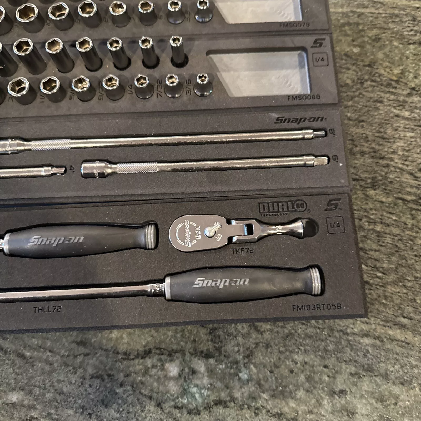 Snap-on-™️ 106 pc 3/8, 1/4” socket extension and ratchet set in foam. 253gss05fmb 3/8 drive set 153gss02fmb 1/4 drive foam sets all in power blue. The foam in dark titanium. This is a great set for any tool box. thanks for looking. Super fast shipping. Most items ship same day.