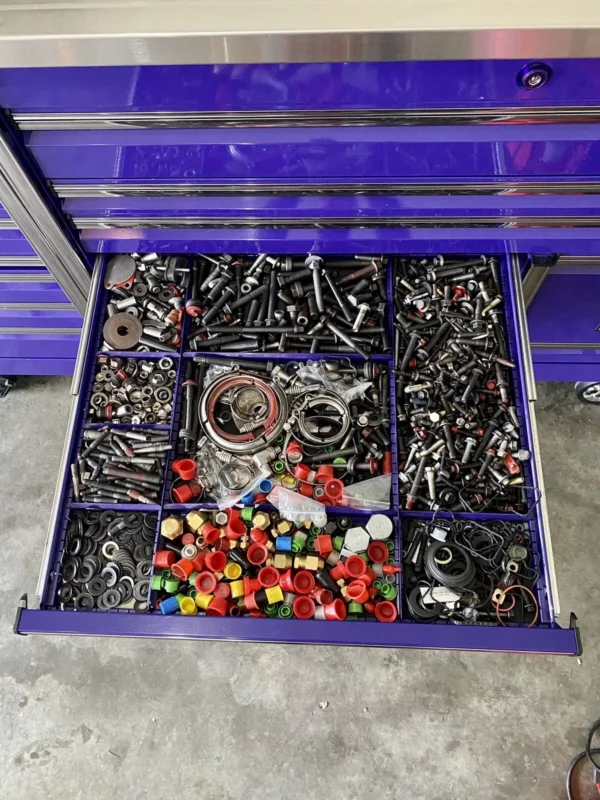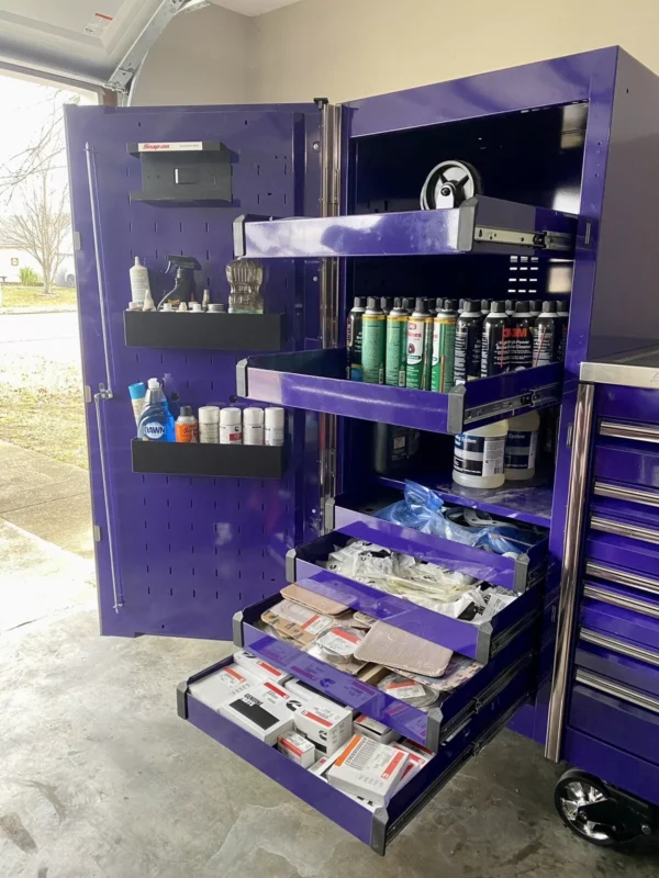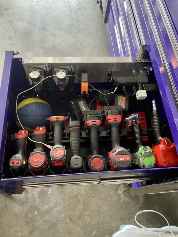 Features include a power drawer with a power strip for battery chargers as well as a rail that holds all of your impacts, drills, etc as well as what Snap On calls a “speedrawer” that has dividers and you can configure it any way you’d like for bolts, nuts, o rings, or Snap On receipts because I know you have a lot of those.