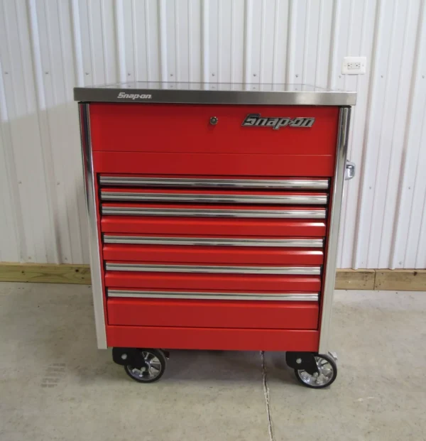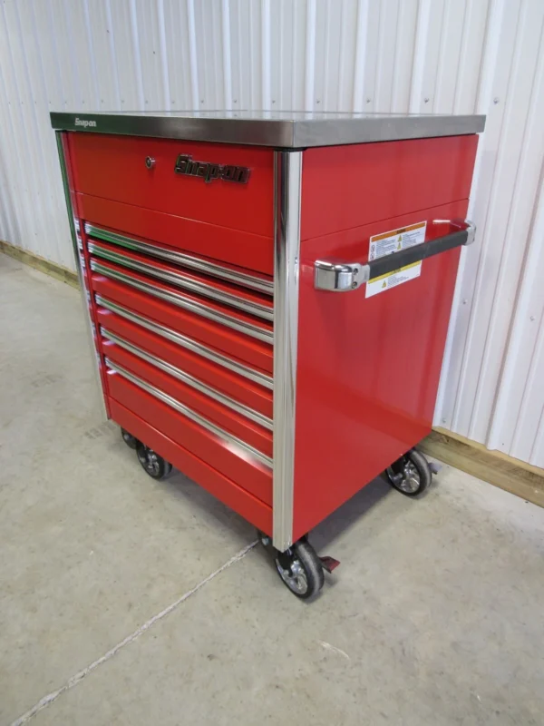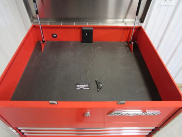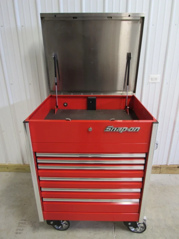 You are looking at a Snap On powder red sidekiq toolbox with a lift up lid with gas springs. The sidekiqs are rare and hard to find! This toolbox is in excellent lightly used condition. The overall dimensions of the cart are 37″ long x 30″ deep x 48″ tall. The drawer liners and key are included.